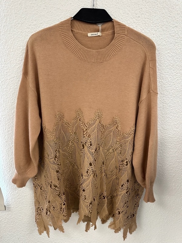 Un modèle raffiné et original, parfait pour allier confort et féminité. Ce pull en maille douce se distingue par sa base en dentelle ajourée au motif feuillage, offrant un jeu de transparence délicat et élégant.