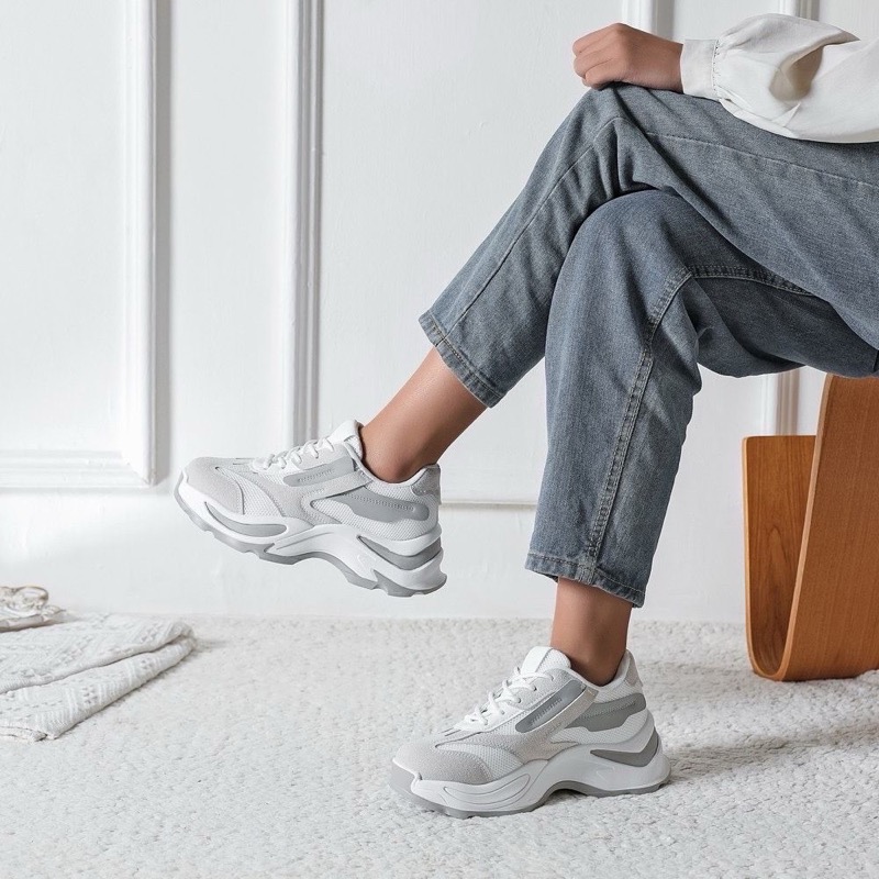 La semelle épaisse sculptée constitue le véritable atout de ces baskets. Elle apporte un excellent amorti, une stabilité optimale et une sensation de confort durable, même après plusieurs heures de marche. Légèrement compensée, elle allonge visuellement la silhouette tout en conservant une démarche fluide et naturelle.