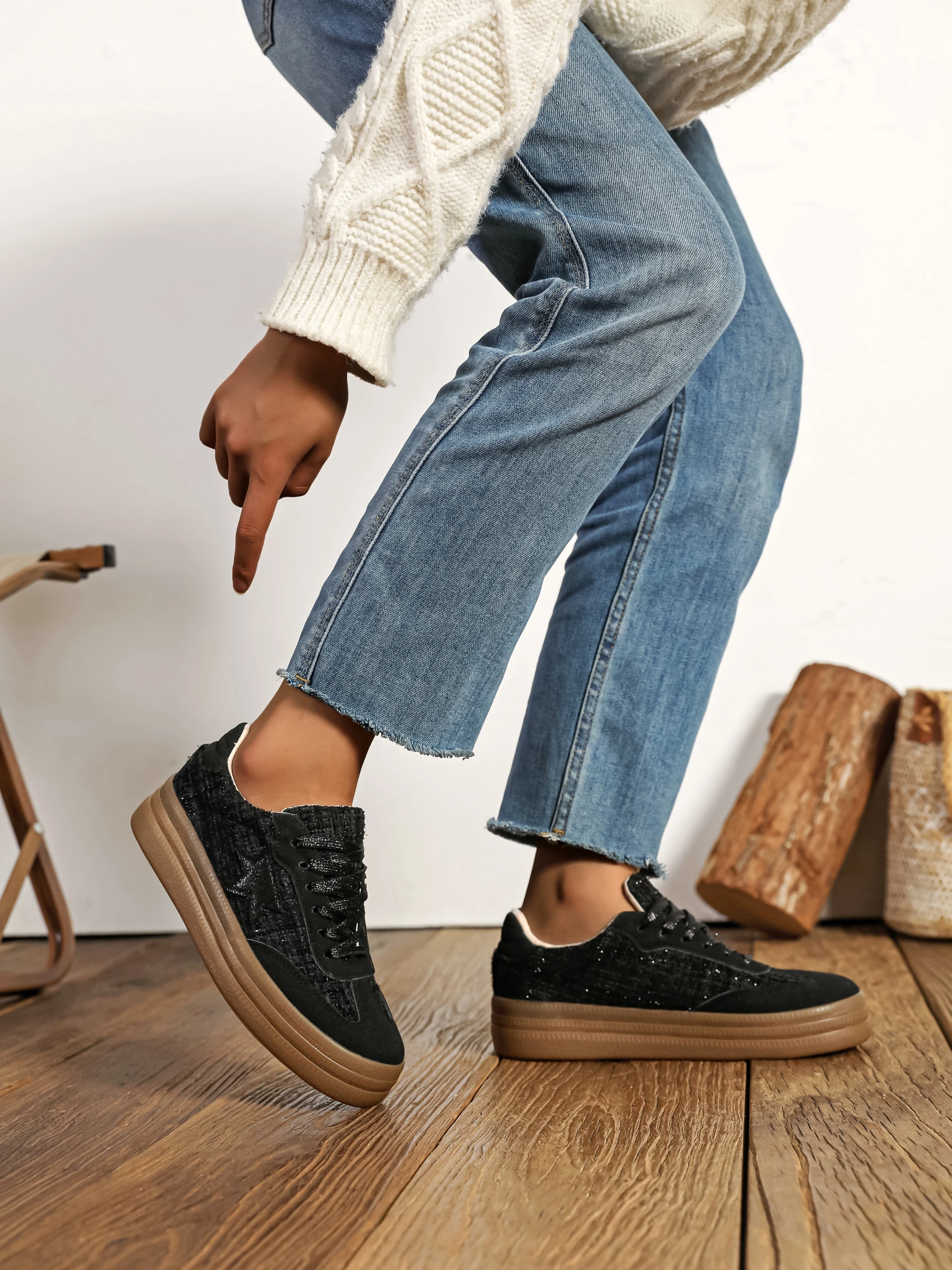 Ces sneakers tendance associent confort et style avec leur design original en tweed texturé et empiècements en suédine. On aime le détail étoile sur le côté qui apporte une touche sportive et moderne. La semelle épaisse assure un bon maintien et un look casual chic.