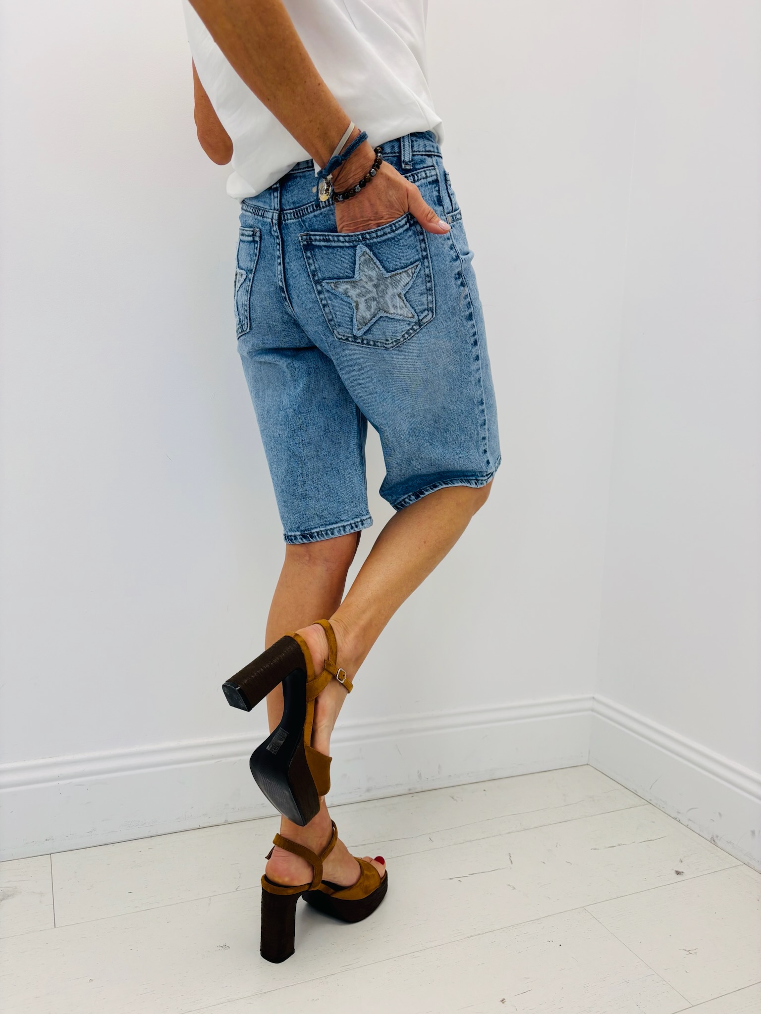 Bermuda Denim Délavé À Détails Étoiles Esprit Casual Tendance