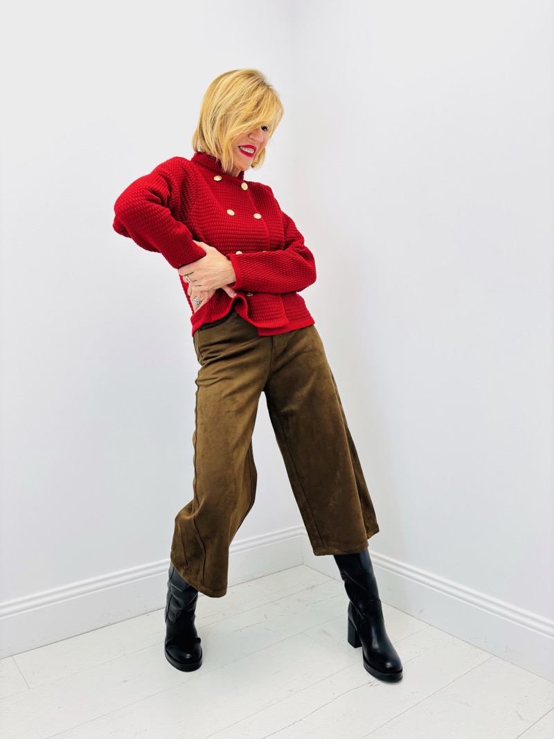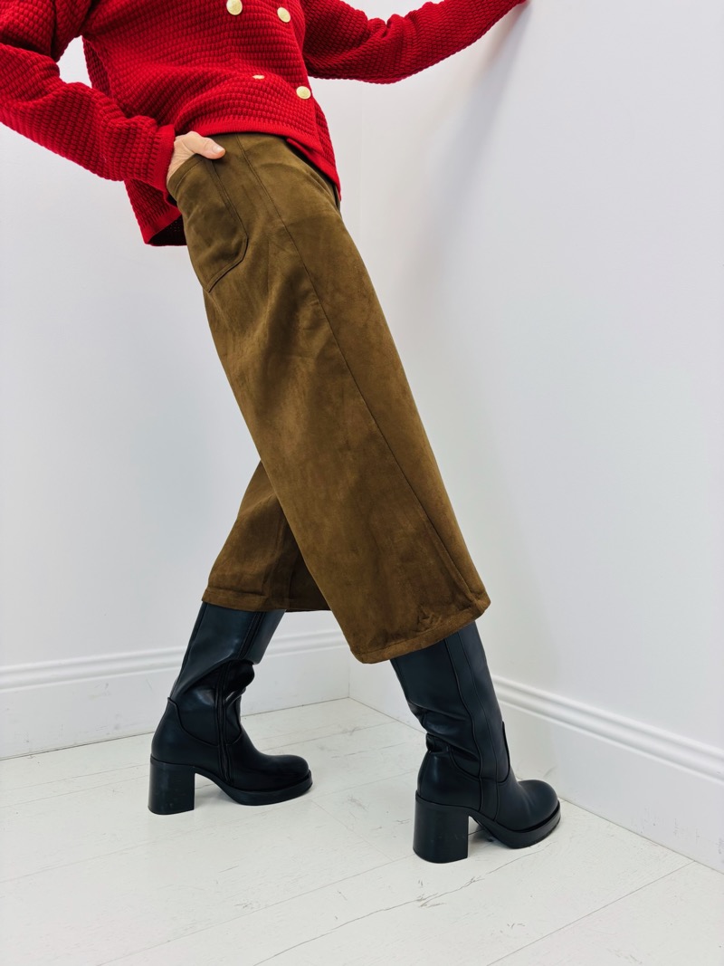 Sur les photos, le bermuda suédine est associé à un pull rouge structuré et des bottes hautes noires pour créer un contraste fort et mode. La silhouette est moderne, élégante et affirmée.