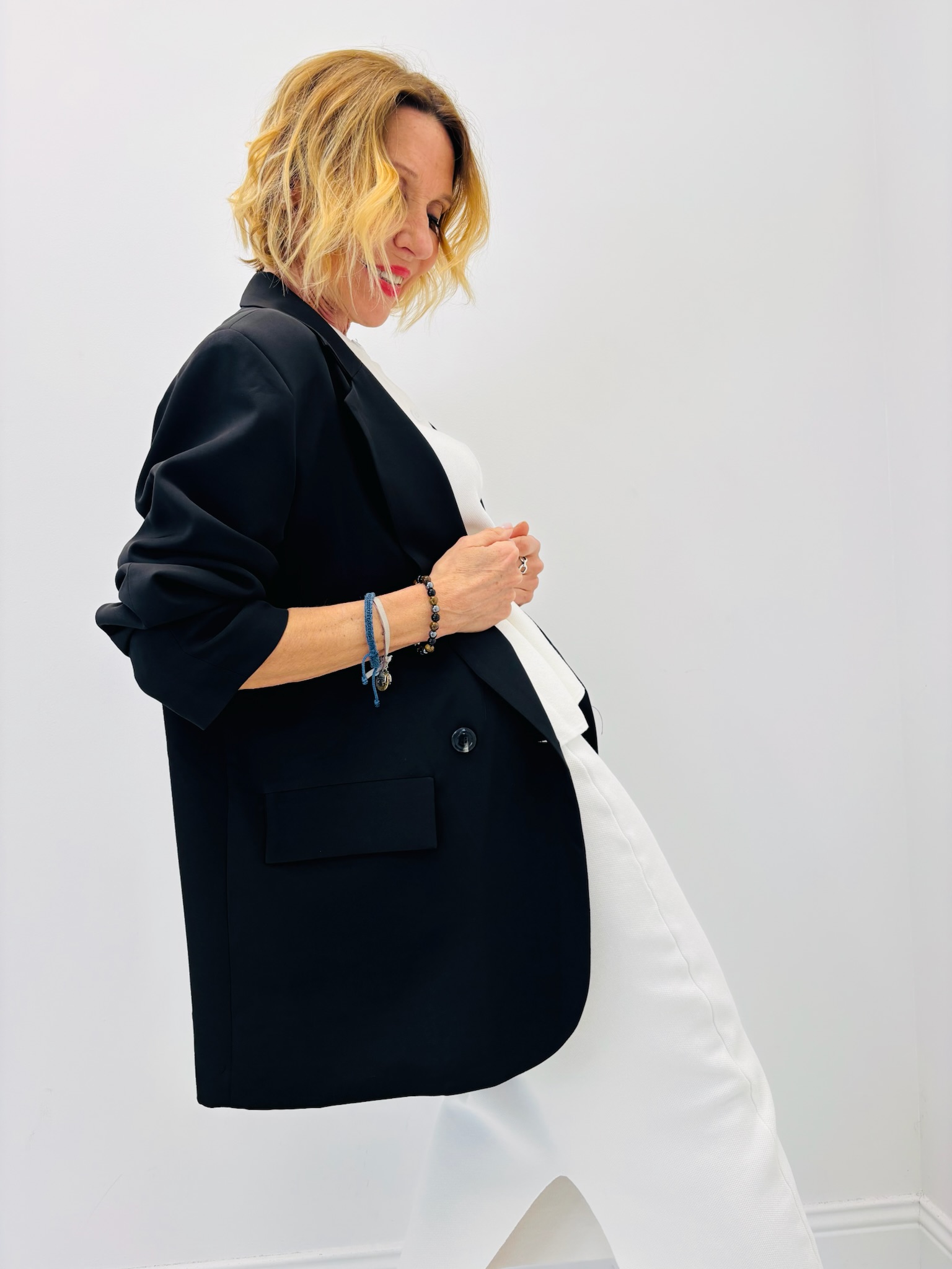 Pour un look mode, il peut être porté ouvert sur un top ajusté ou une chemise légère. Associé à des escarpins, des mocassins ou même des baskets, il apporte immédiatement une touche structurée et élégante à la tenue.