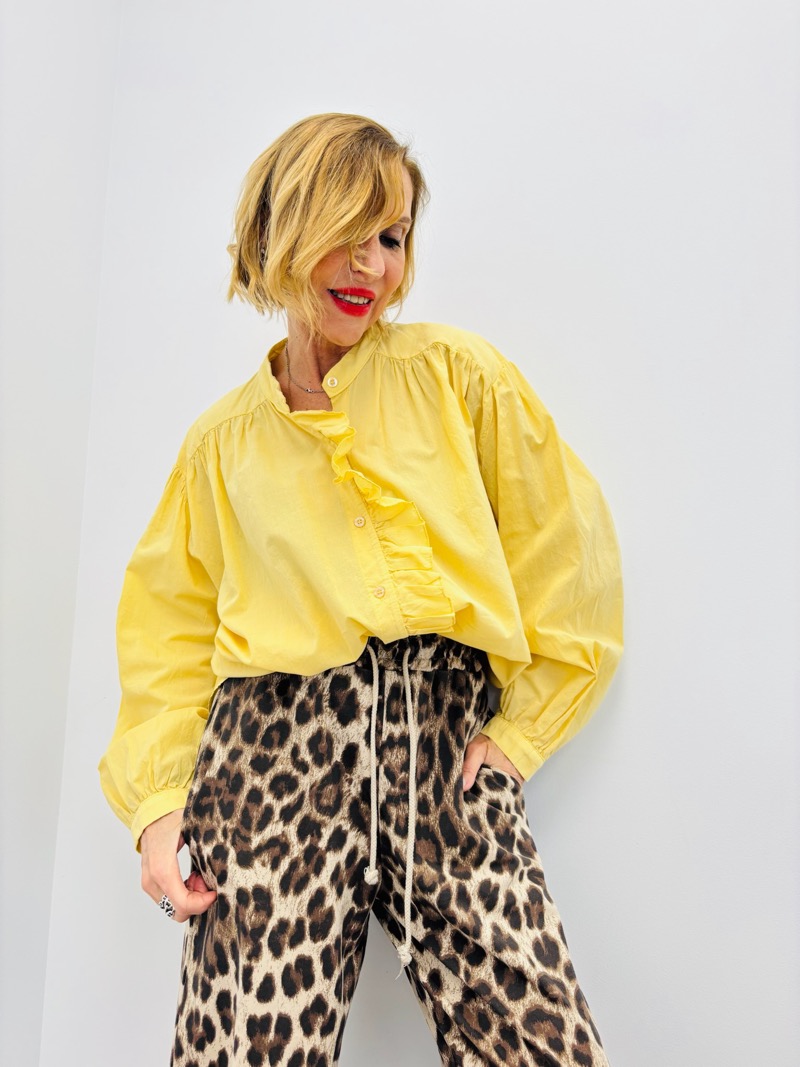 Cette blouse à volants est une pièce féminine et raffinée qui apporte immédiatement une touche romantique chic à la silhouette. Son design élégant, souligné par un volant central délicat, revisite le classique de la blouse en coton avec modernité et douceur.