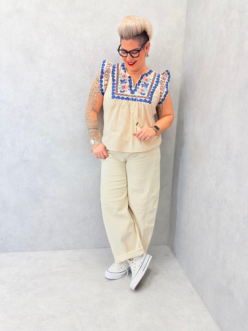 Le décolleté en V, souligné par de délicates broderies graphiques et florales, met subtilement en valeur le haut du buste. Les liens à nouer avec pompons ajoutent une touche bohème et féminine, tout en permettant d’ajuster l’ouverture selon le style souhaité. Les manches courtes volantées apportent du mouvement et une finition élégante, tout en offrant une couvrance légère et flatteuse pour les bras.