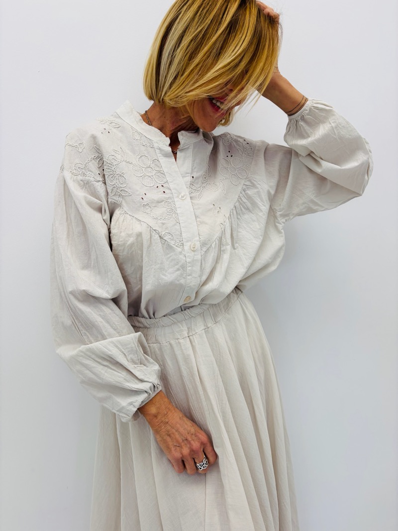 Son design se distingue par un empiècement délicatement brodé sur le haut du buste, apportant relief et raffinement à la pièce. Les broderies florales discrètes soulignent le caractère féminin et artisanal du modèle, tout en restant faciles à porter au quotidien.