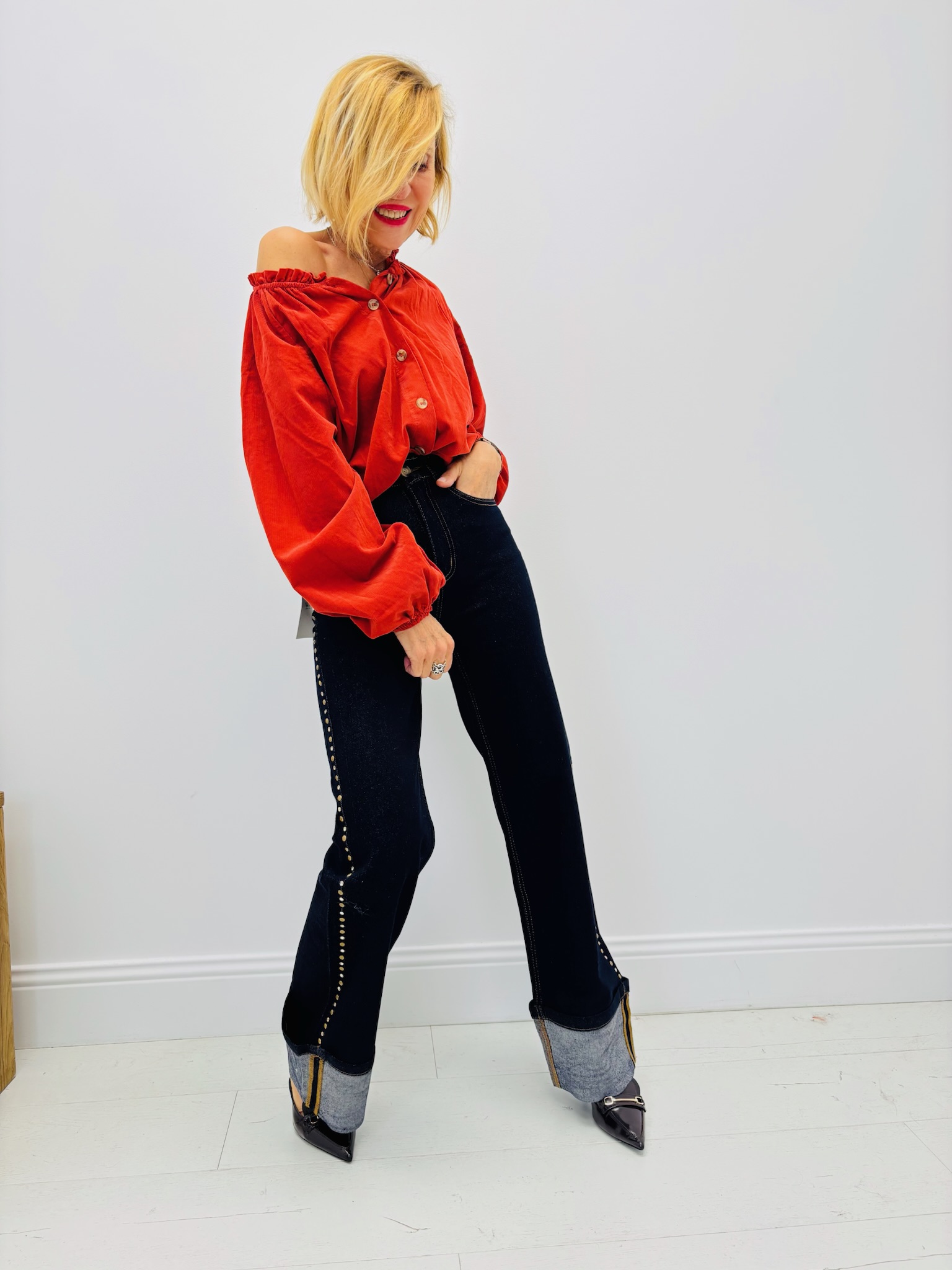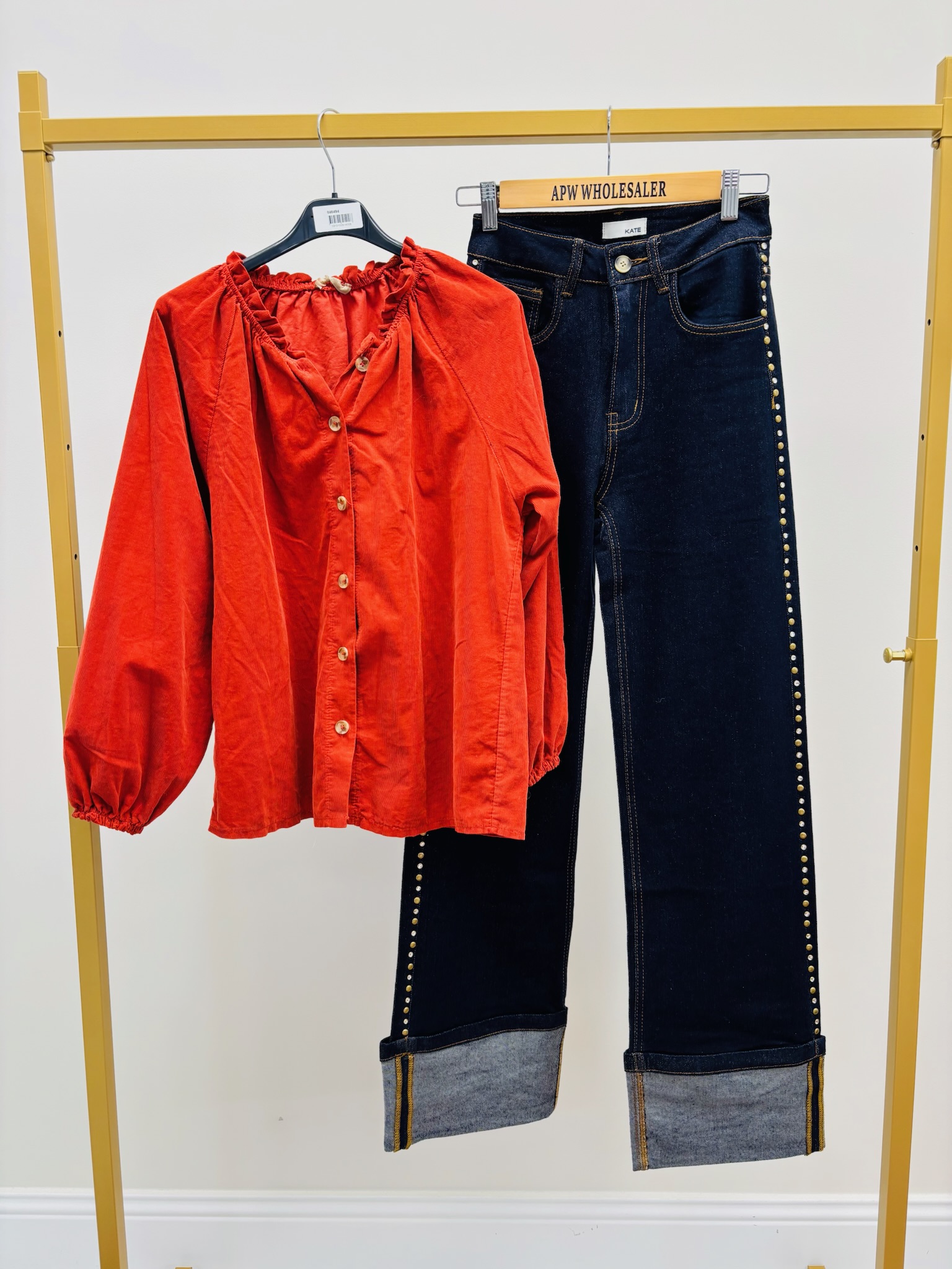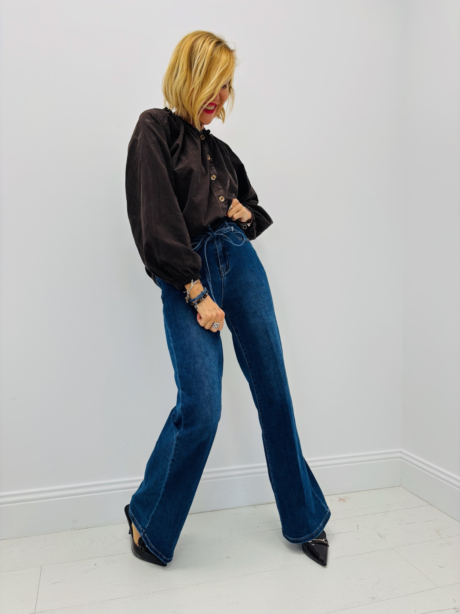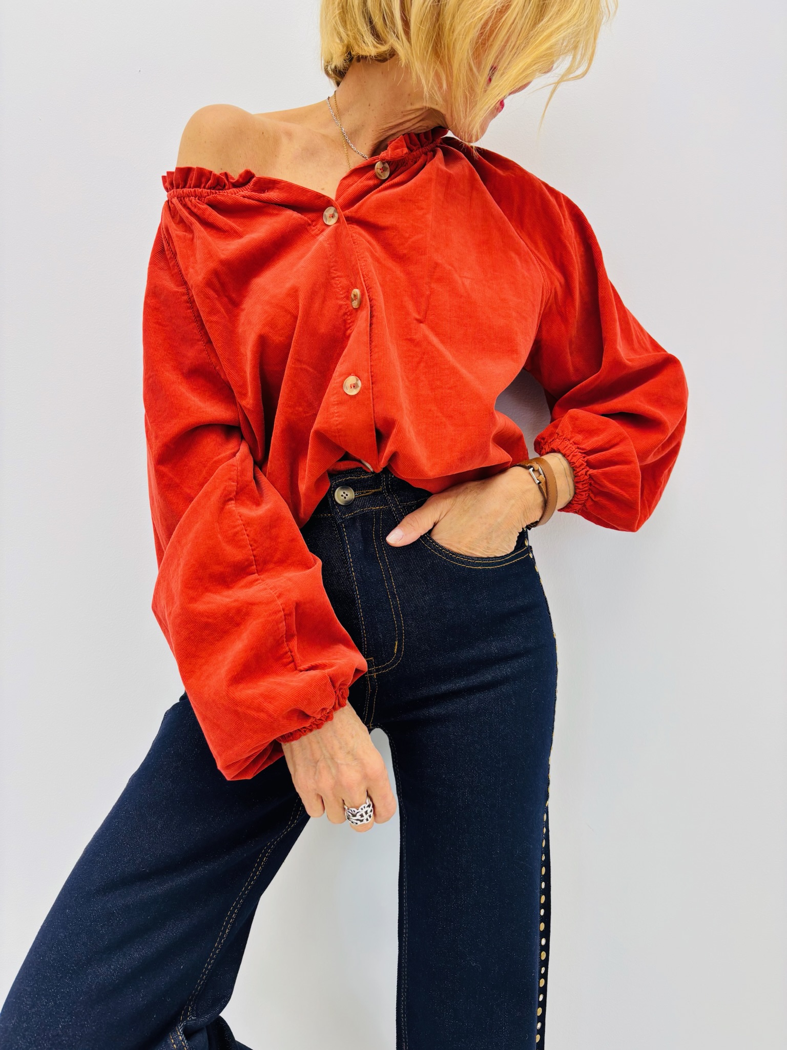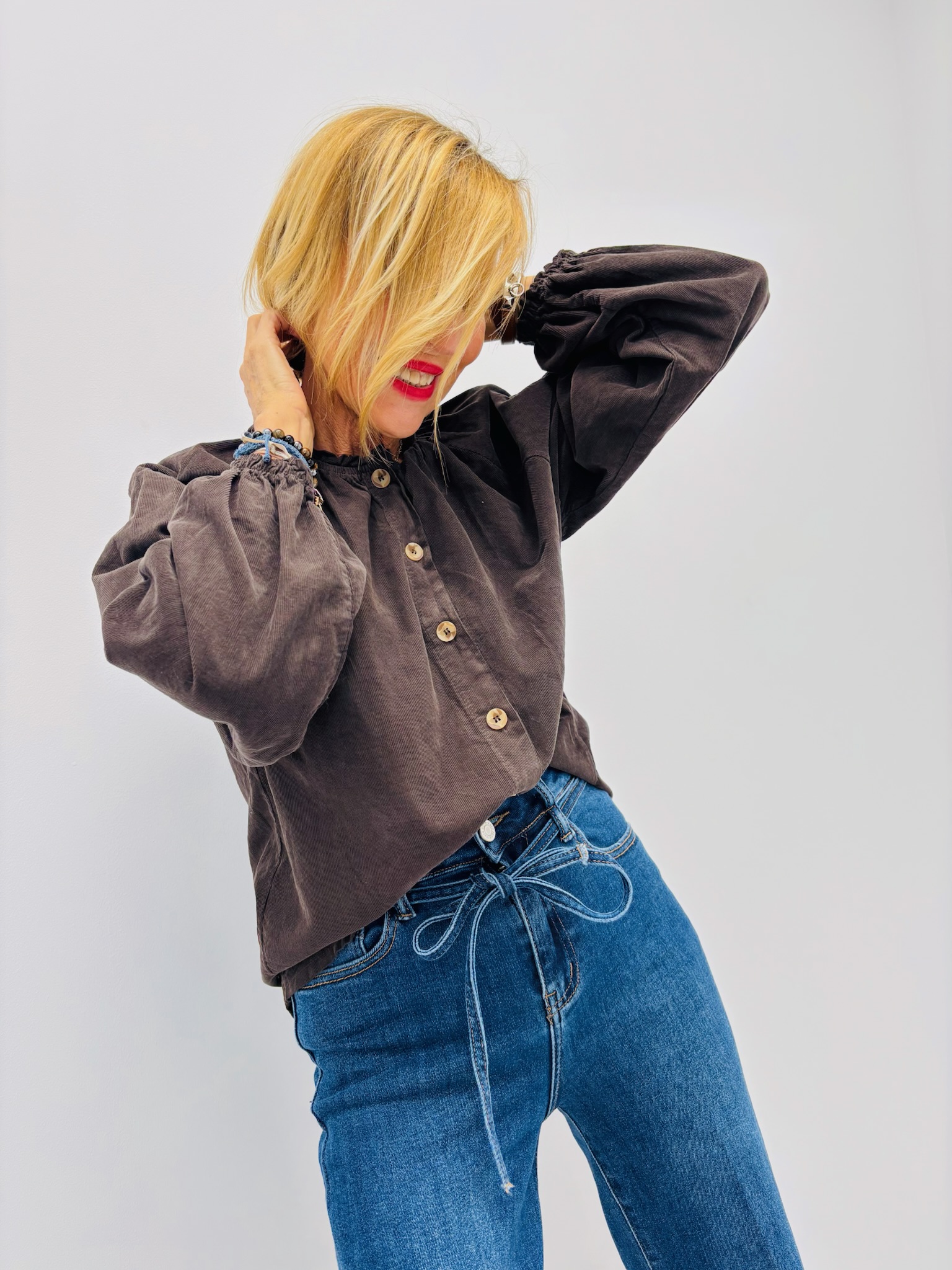 Une pièce pleine de charme à la fois chic et décontractée. Confectionnée dans un velours raté 100 % coton, cette blouse italienne séduit par sa texture douce et sa coupe romantique. Les détails froncés et les boutons en bois lui donnent une touche bohème élégante.