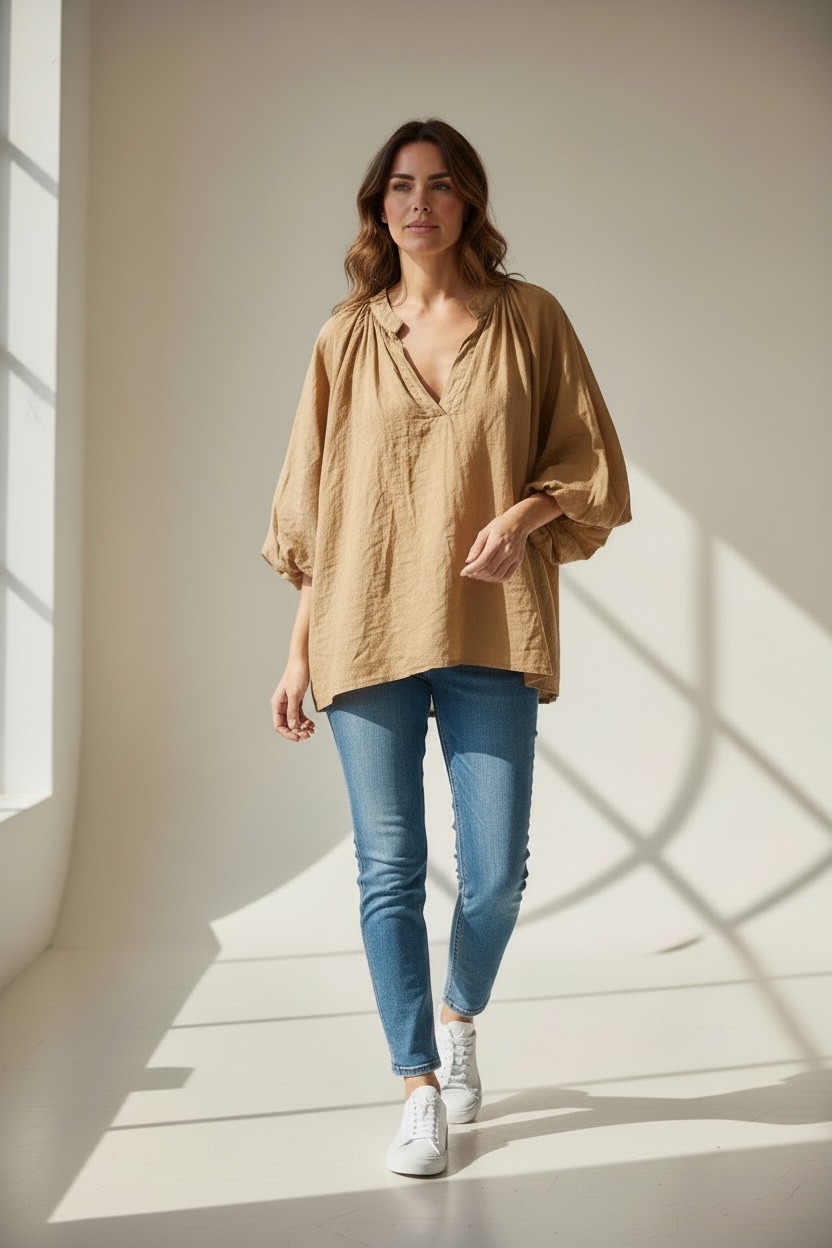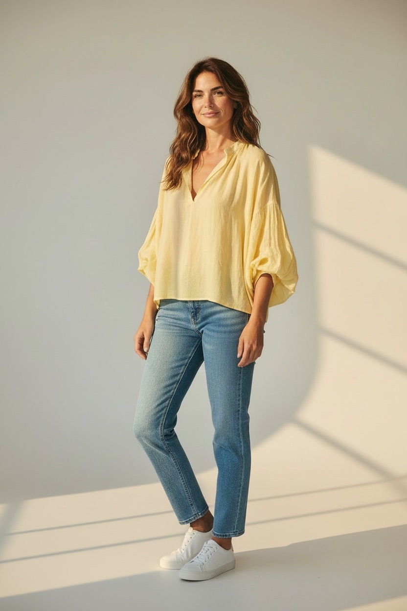 Portée avec un jean taille haute ou un pantalon fluide, cette blouse crée une silhouette élégante et décontractée. Elle peut être rentrée pour structurer le look ou portée loose pour un esprit plus bohème. Une pièce idéale pour composer des tenues fraîches, modernes et faciles à valoriser en boutique, aussi bien en vitrine qu’en look du quotidien.