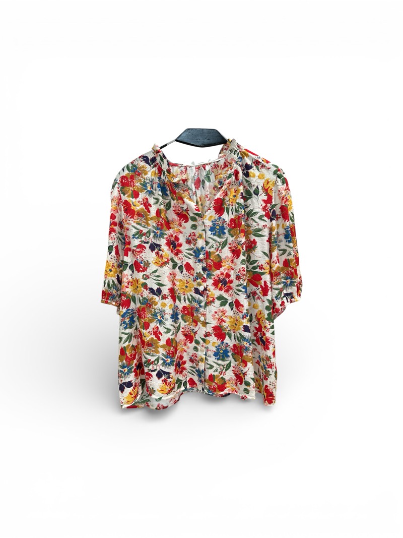 Les manches courtes assurent une sensation de légèreté et rendent cette blouse particulièrement agréable à porter lors des journées plus chaudes. La fermeture boutonnée sur le devant permet un enfilage facile et offre plusieurs possibilités de style, ouverte ou fermée selon l’allure souhaitée. L’imprimé floral, travaillé dans un mélange harmonieux de couleurs, dynamise la pièce tout en restant facile à associer.