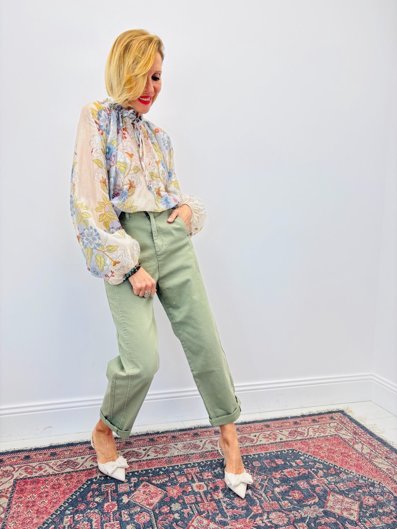 Portée rentrée dans un pantalon taille haute, elle structure immédiatement la silhouette tout en conservant un mouvement fluide et naturel. Associée à un pantalon vert sauge, beige ou denim clair, elle compose un look harmonieux et lumineux.