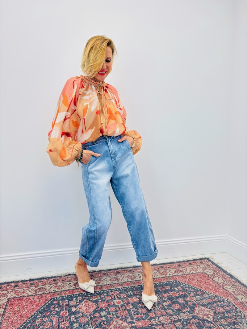 Elle peut également se porter plus loose sur un jean pour une allure casual chic moderne. Le lien au col permet de moduler le style selon l’univers recherché : noué pour un esprit romantique ou ouvert pour une silhouette plus décontractée.