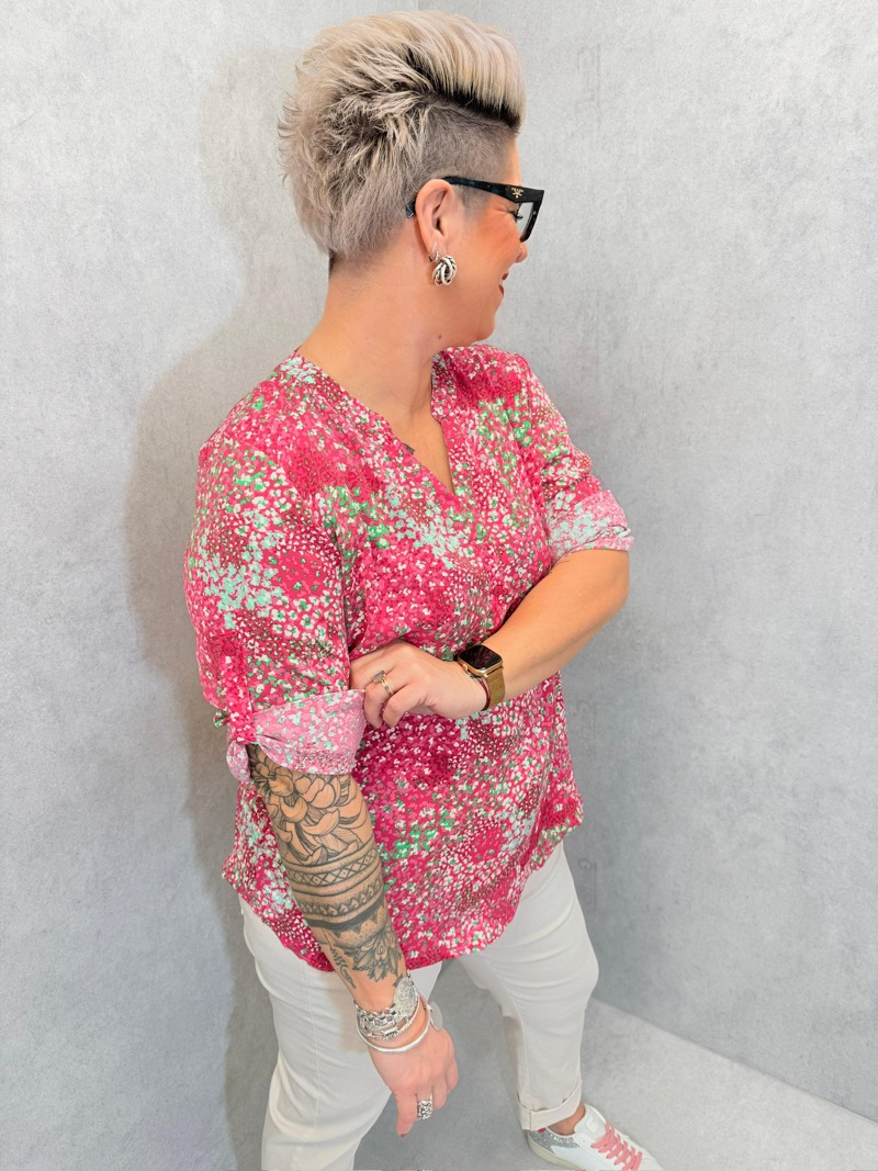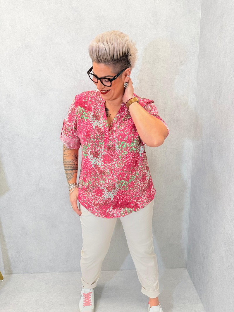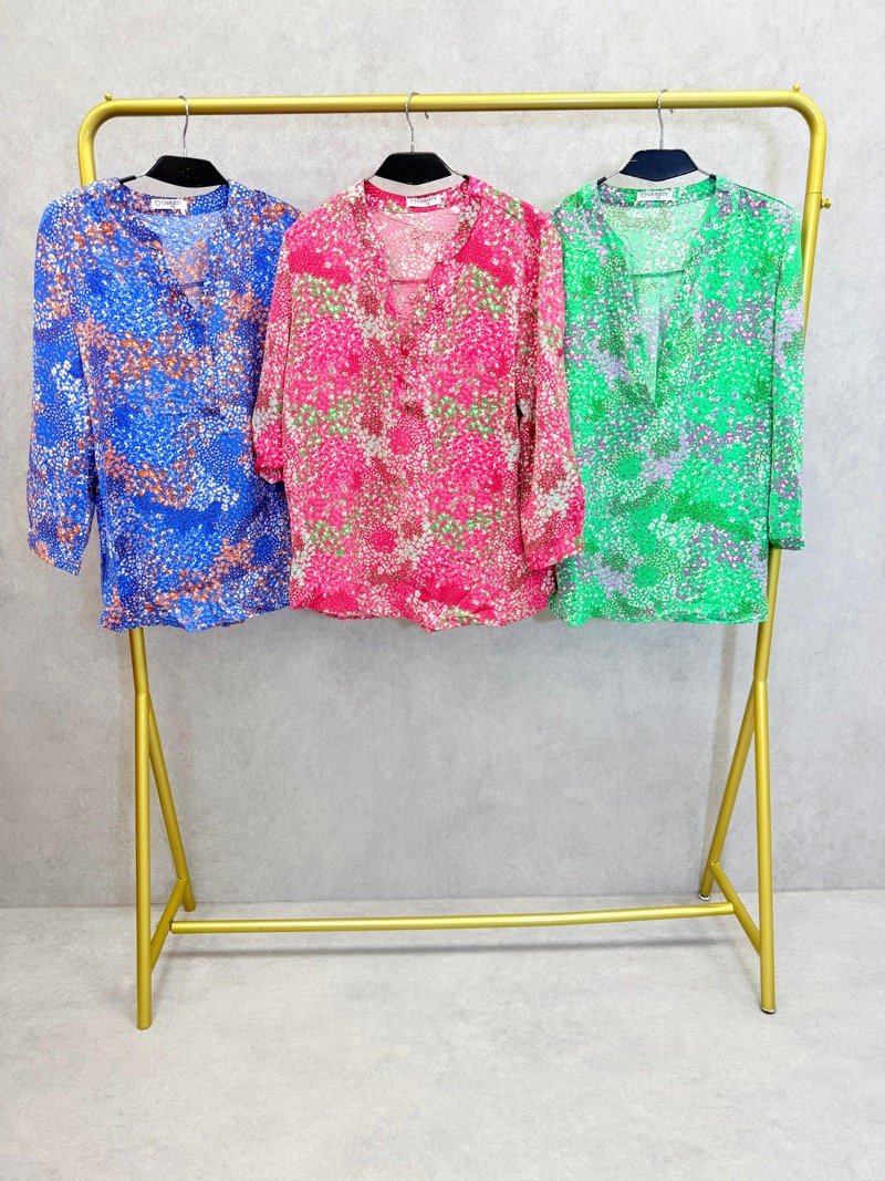 Les manches longues, facilement retroussables, permettent d’adapter la blouse à toutes les saisons et à différents styles. Que ce soit pour une journée de travail, une sortie entre amies ou un événement plus habillé, cette blouse s’impose comme une valeur sûre. Son imprimé fin et lumineux attire le regard sans être excessif, ce qui en fait une pièce facile à associer et très appréciée en boutique.
