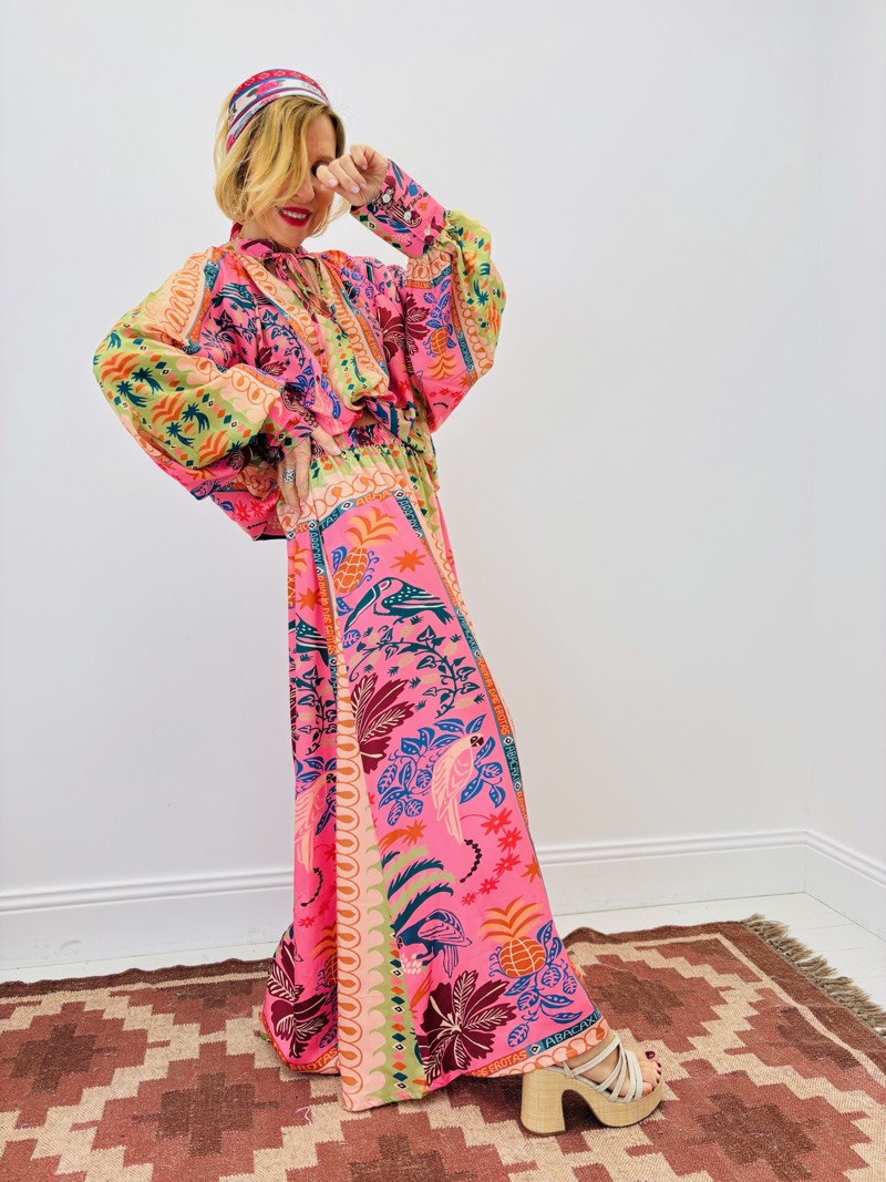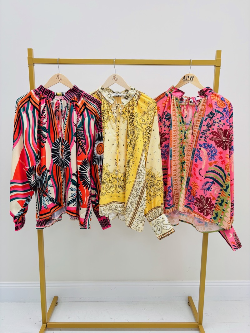 Son col légèrement froncé avec lien à nouer structure l’encolure et apporte une touche romantique. Les manches longues volumineuses renforcent l’effet bohème tandis que les poignets resserrés équilibrent la silhouette. L’imprimé est riche, coloré et travaillé dans un esprit méditerranéen / Dolce Vita très tendance. Chaque coloris raconte une histoire visuelle forte, idéale pour créer des vitrines impactantes.