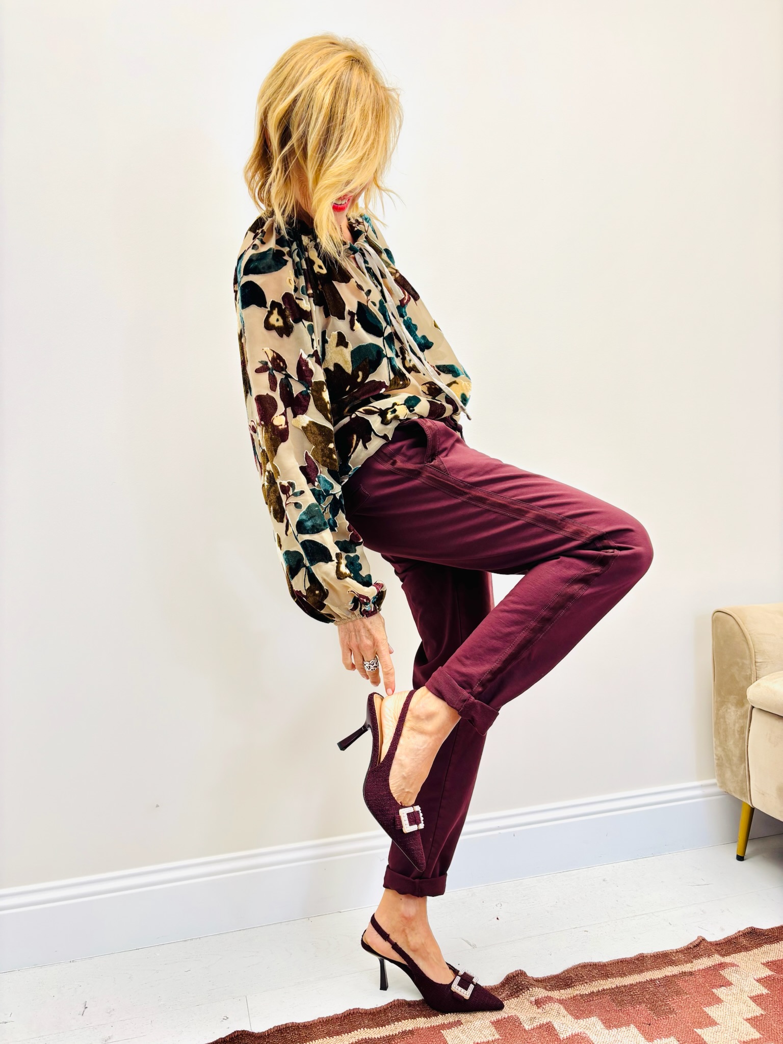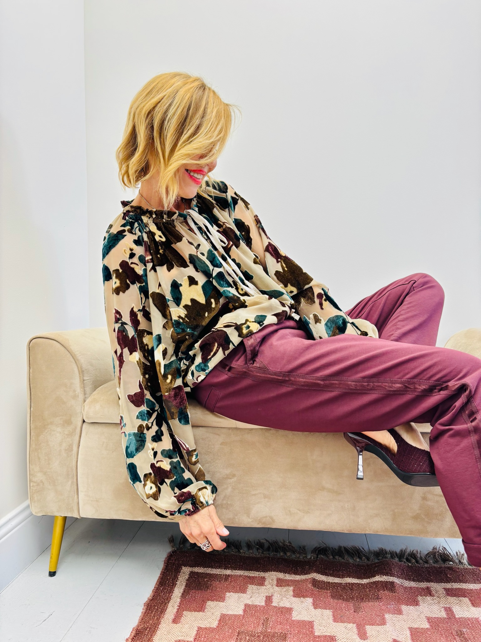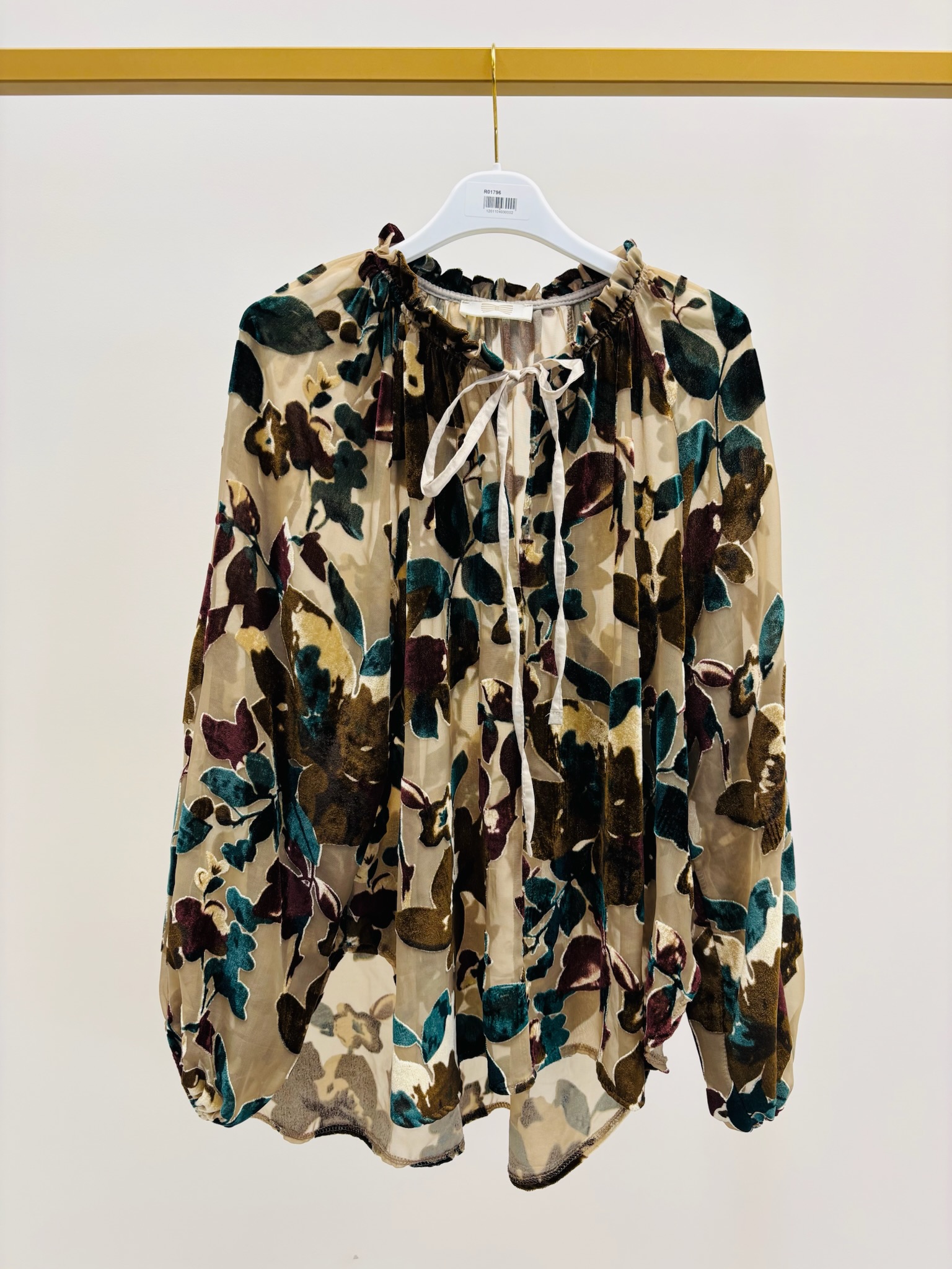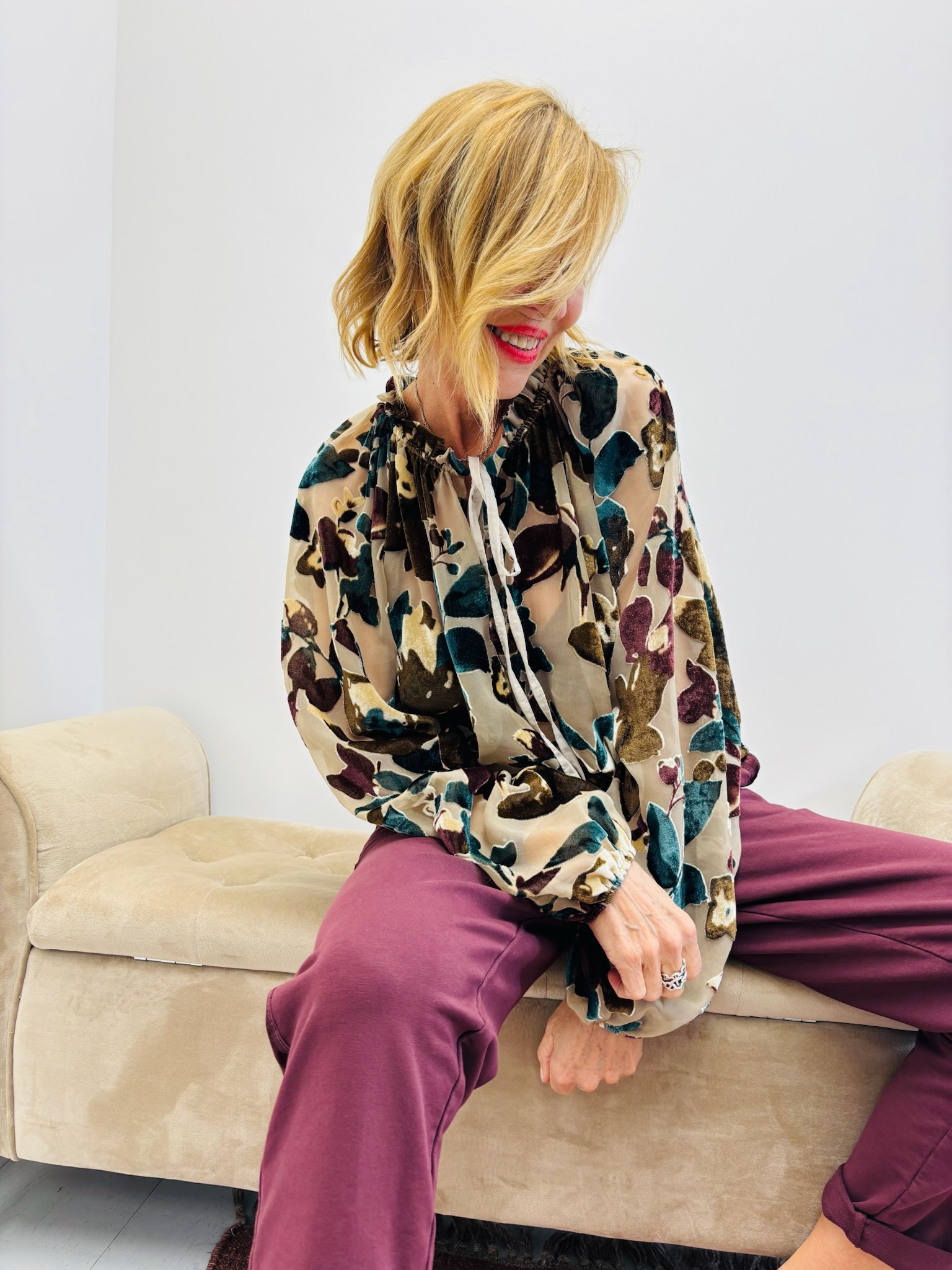 Cette blouse transparente séduit par son tissu aérien et son imprimé floral en velours qui capte la lumière avec élégance.