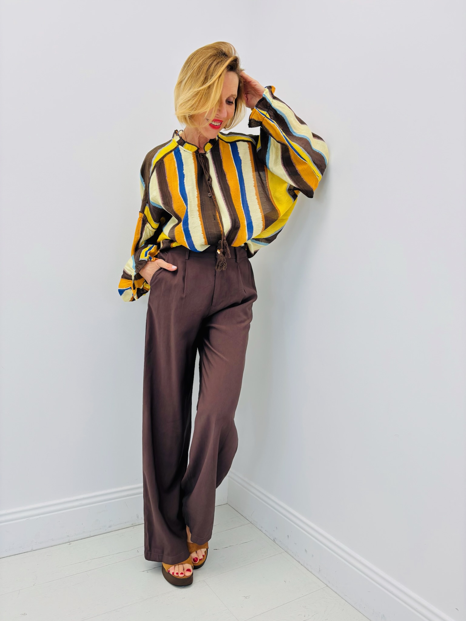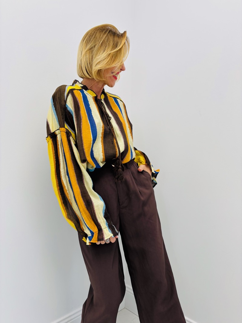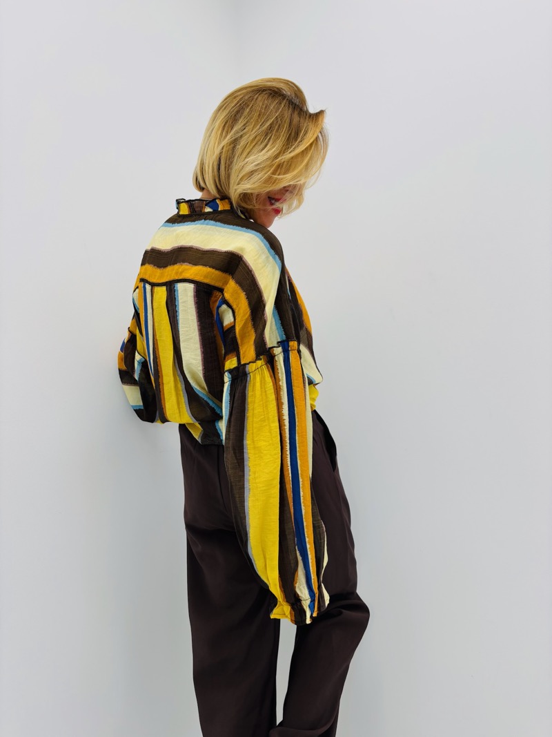 Cette blouse rayée multicolore se distingue par son style bohème chic et son jeu de couleurs vibrant. Les rayures verticales aux tons chauds et contrastés (jaune, marron, bleu, écru) apportent du caractère tout en allongeant visuellement la silhouette.
