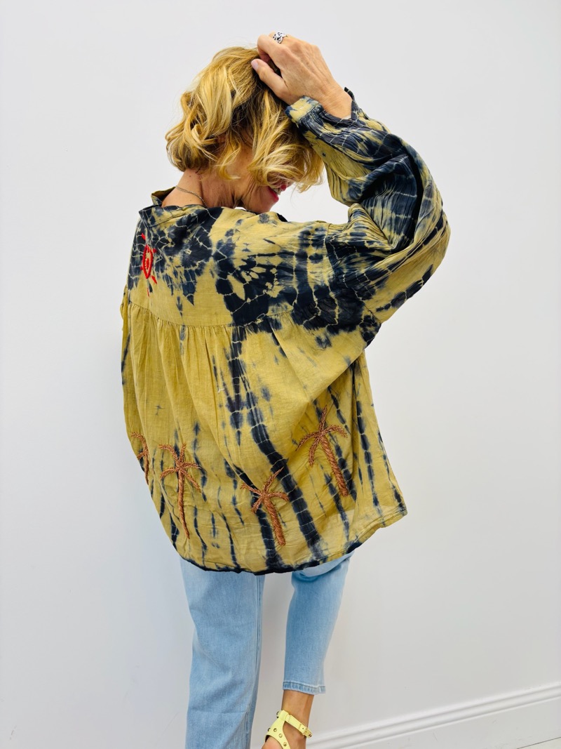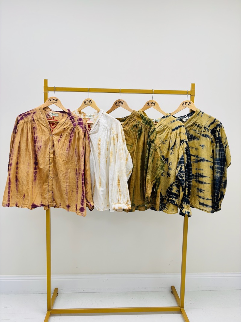 Confectionnée en 100% coton, elle offre une matière légère, respirante et agréable à porter. Son tissu légèrement texturé accentue l’effet authentique du tie & dye, tout en garantissant confort et fluidité. Chaque modèle présente des variations de teinture qui font de chaque blouse une pièce singulière.