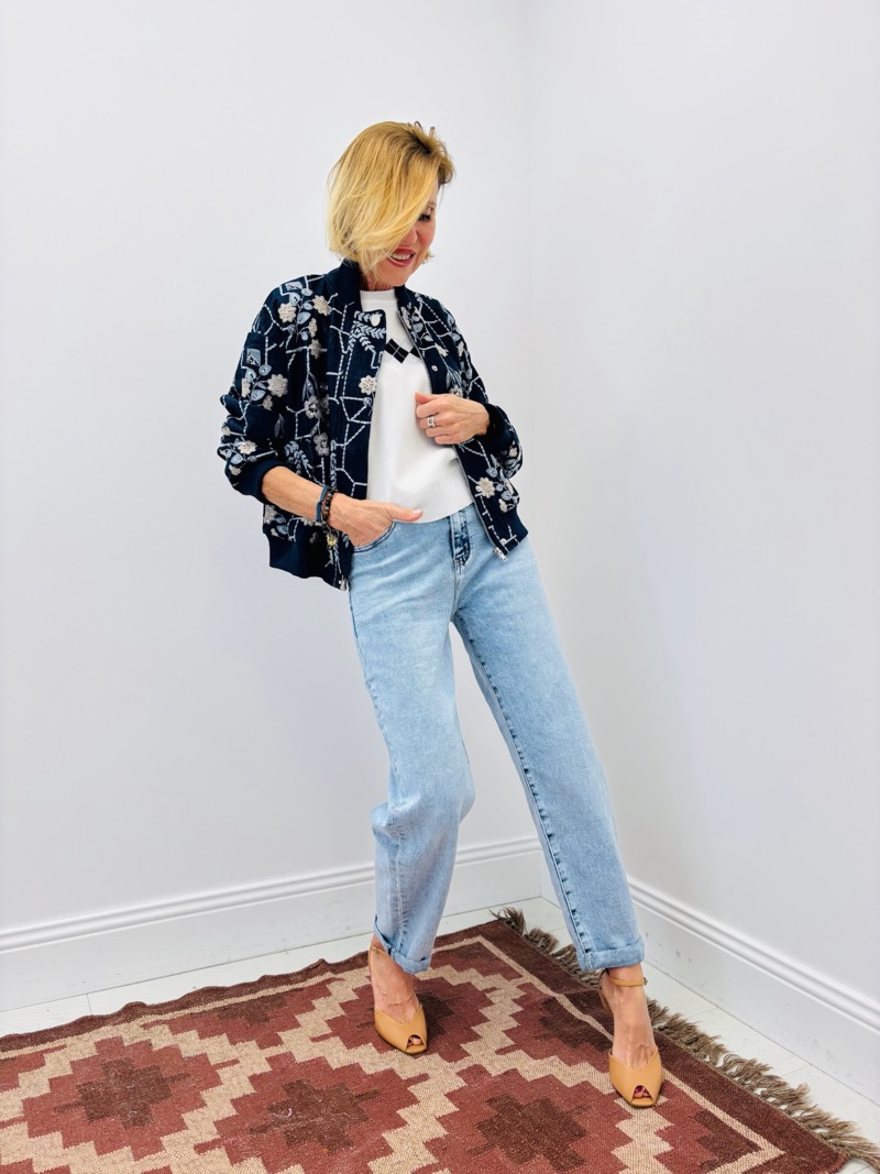 Son motif brodé floral sur l’ensemble de la pièce crée un effet visuel riche et sophistiqué. Les fleurs délicatement travaillées contrastent parfaitement avec le fond denim pour un rendu premium.