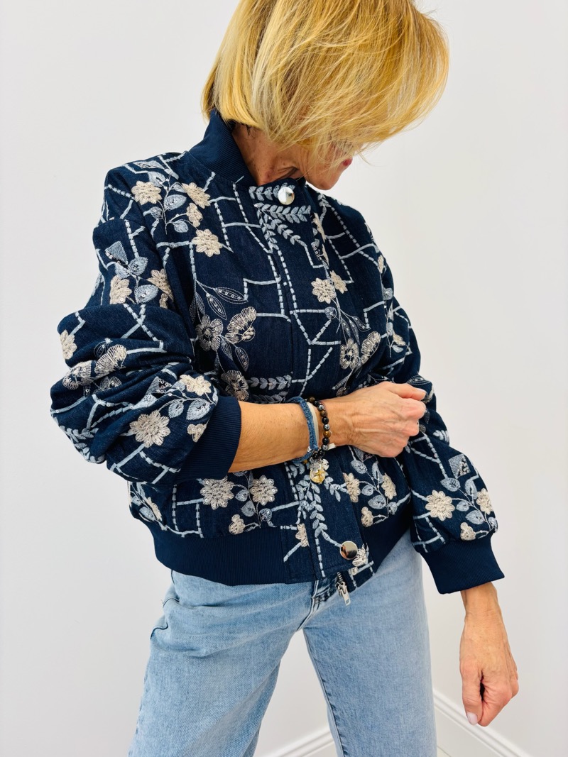 Ce blouson en denim revisité se distingue par son somptueux travail de broderies florales contrastées sur fond bleu profond. À mi-chemin entre la veste bomber et la pièce couture, il combine modernité, féminité et caractère.