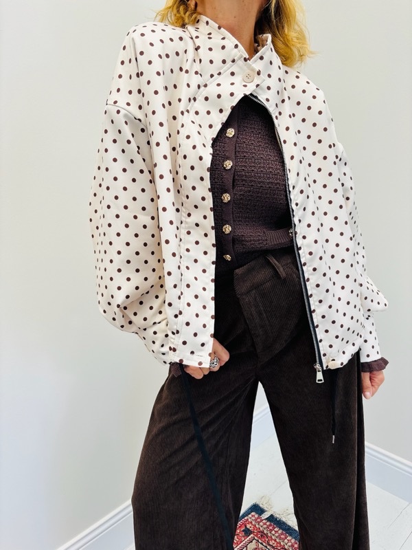 Un bombers léger et tendance, revisité avec un imprimé pois intemporel. Sa coupe ample et décontractée lui confère un look casual chic, parfait pour la mi-saison.