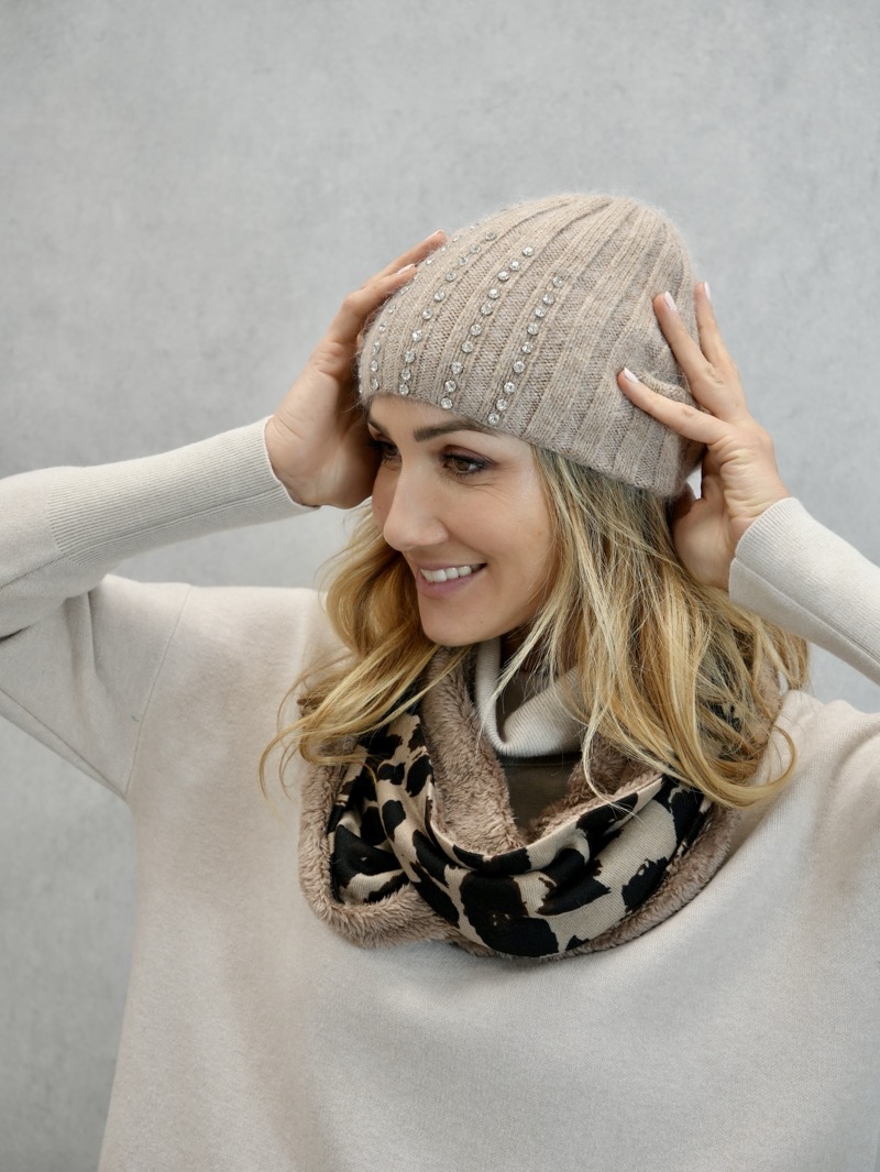 Ce bonnet apporte instantanément une touche chic, moderne et lumineuse. Porté légèrement en arrière, il encadre le visage avec douceur et met en valeur les traits grâce aux strass qui captent la lumière naturelle. Il s’associe parfaitement avec un manteau long, une doudoune élégante ou un pull en maille crème pour un look d’hiver raffiné.