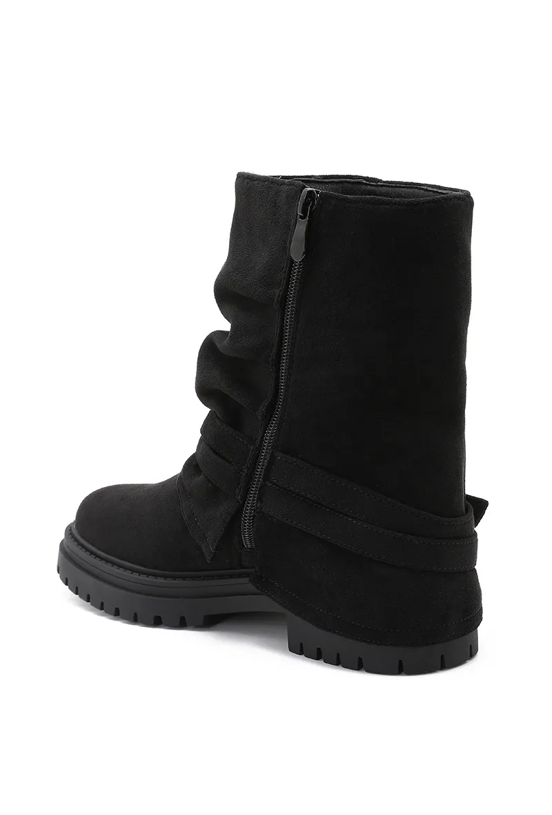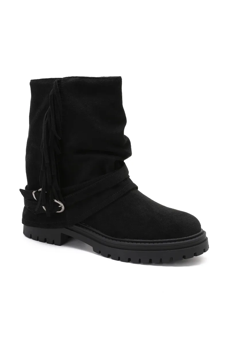 Alliez confort et style avec ces bottines à la coupe décontractée et tendance. Réalisées en matière effet daim, elles se distinguent par leur design plissé et leur détail franges latérales, apportant une touche bohème-chic à vos looks. Leur semelle crantée en caoutchouc assure une excellente adhérence et un confort optimal au quotidien. La fermeture zippée latérale permet un enfilage facile.