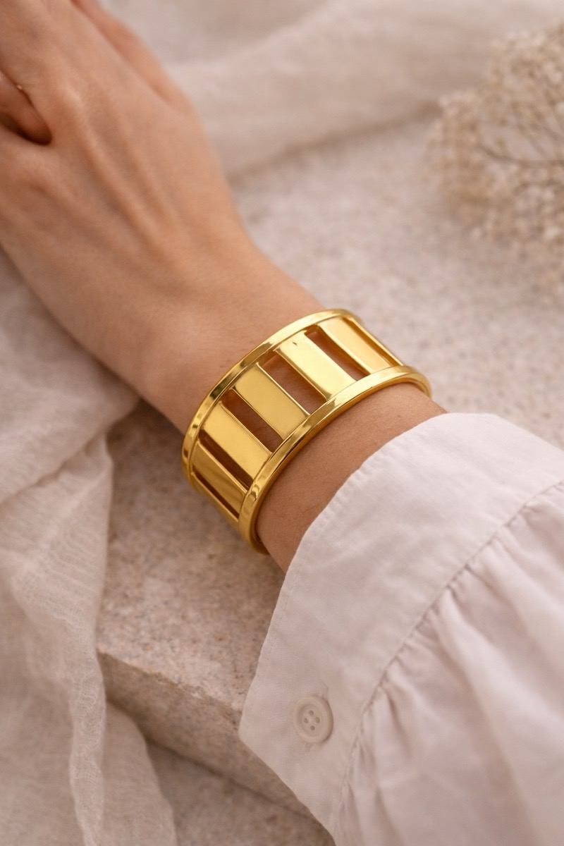 Porté seul, ce bracelet devient immédiatement la pièce forte du look et attire naturellement la lumière. Il accompagne parfaitement une tenue simple comme une chemise blanche, une robe fluide ou un ensemble minimaliste.
