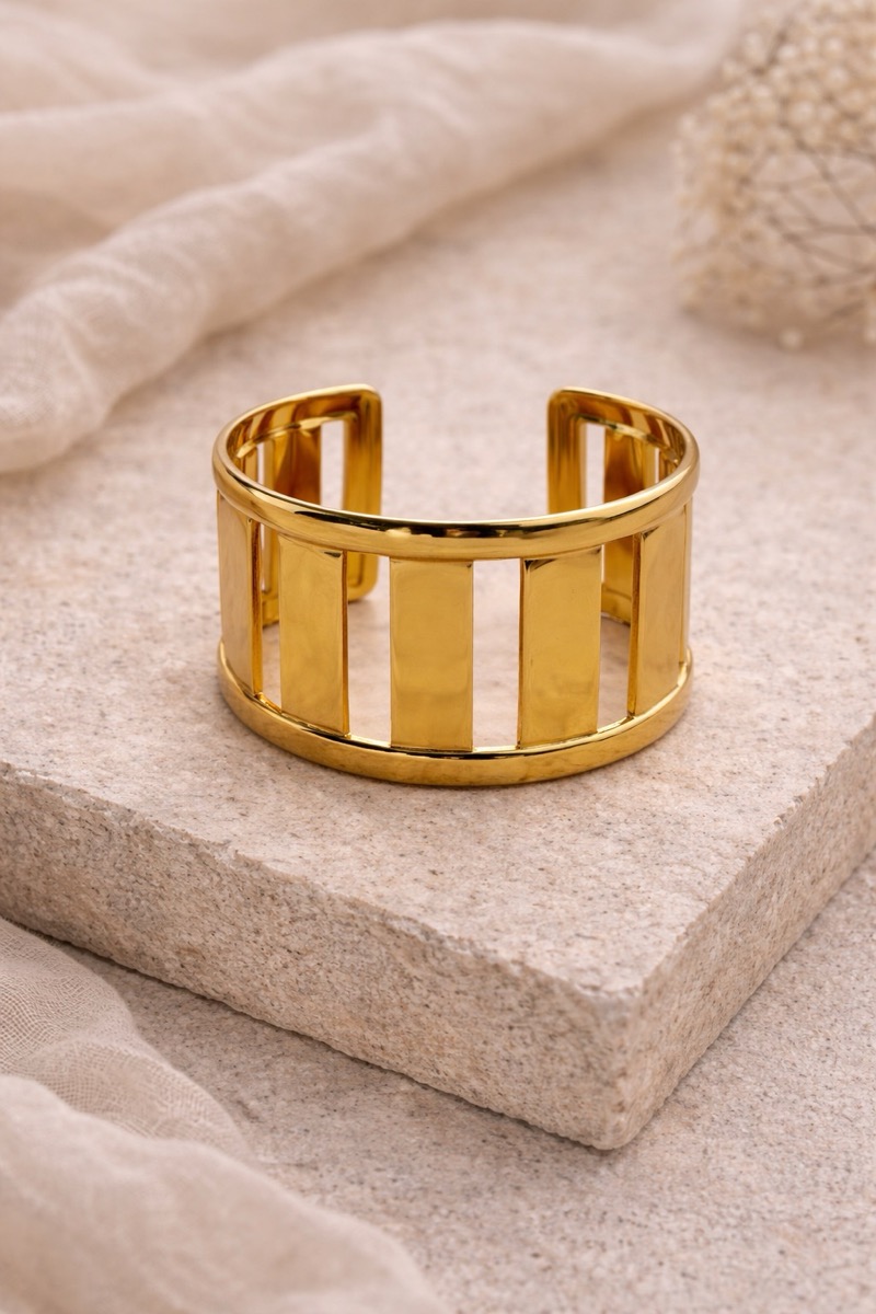 Ce bracelet manchette doré séduit par son design moderne et structuré qui apporte immédiatement une touche élégante et sophistiquée à la silhouette. Son motif graphique composé de bandes verticales crée un jeu de lumière subtil qui attire le regard tout en restant chic et minimaliste.