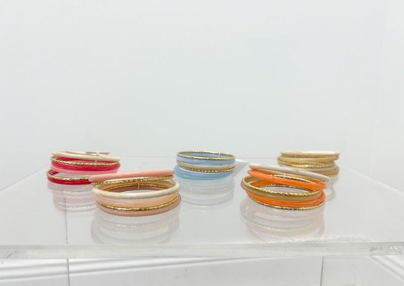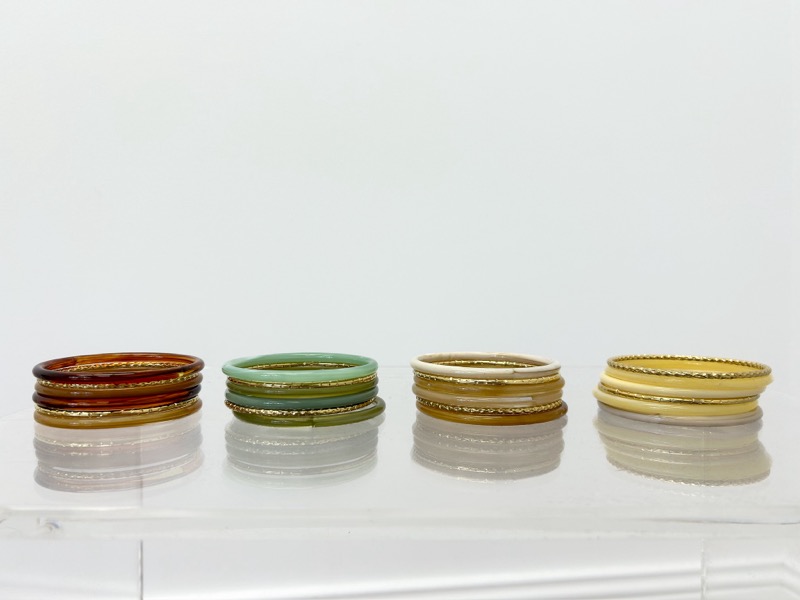 Ce bracelet multi-joncs séduit par son élégance discrète et son esprit résolument moderne. Composé de plusieurs joncs fins en résine lisse, il joue sur l’accumulation pour créer un effet chic et structuré au poignet. Les détails dorés, subtilement intégrés, apportent une touche lumineuse et raffinée qui rehausse immédiatement la tenue.