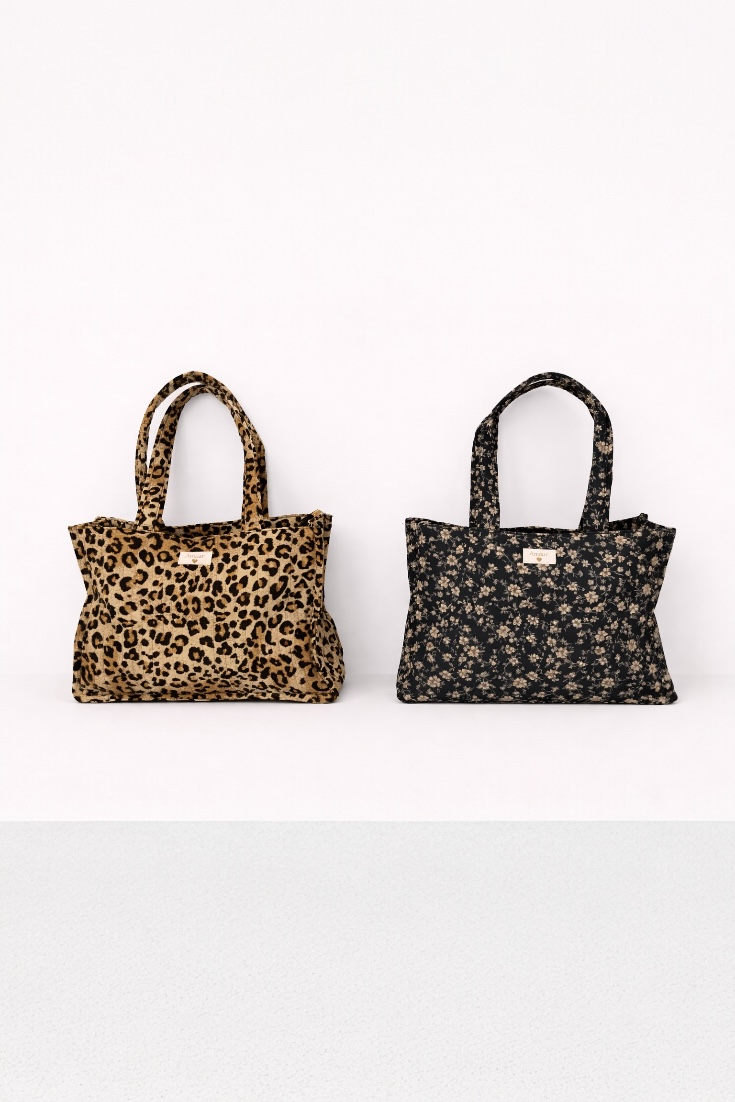 Décliné en deux imprimés forts – fleurs délicates sur fond noir ou léopard audacieux – il s’adapte à toutes les envies : bohème chic ou urbain affirmé. Le petit patch “Amour” cousu à l’avant apporte une touche parisienne subtile et tendance.