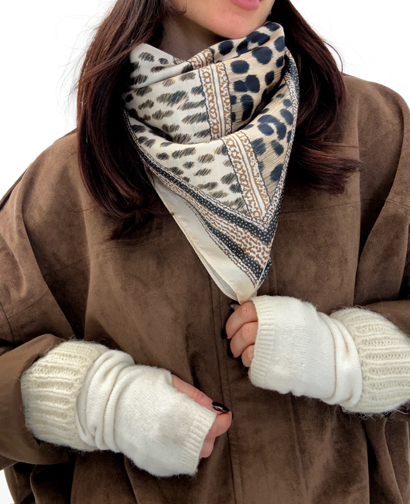 Porté noué autour du cou avec un manteau ou une veste, ce carré apporte une touche élégante et structurée à la tenue. Il se porte également façon triangle pour un style plus casual chic, ou attaché à un sac pour personnaliser un look. Un accessoire facile à adopter, parfait pour rehausser une silhouette avec caractère et raffinement.