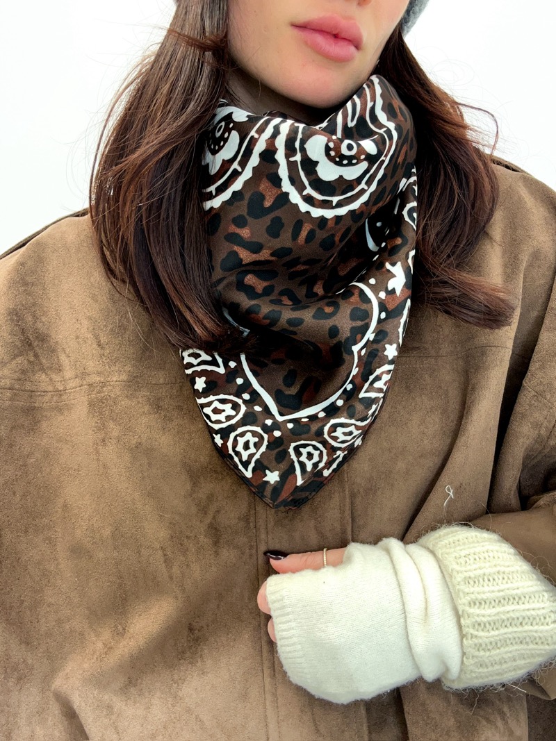 Porté autour du cou avec une veste ou un manteau uni, ce carré devient immédiatement la pièce maîtresse de la tenue. Il se porte également façon triangle pour un look plus enveloppant et bohème chic, ou noué plus serré pour une allure élégante et structurée. Parfait pour apporter du caractère et du style à une silhouette simple, sans effort.