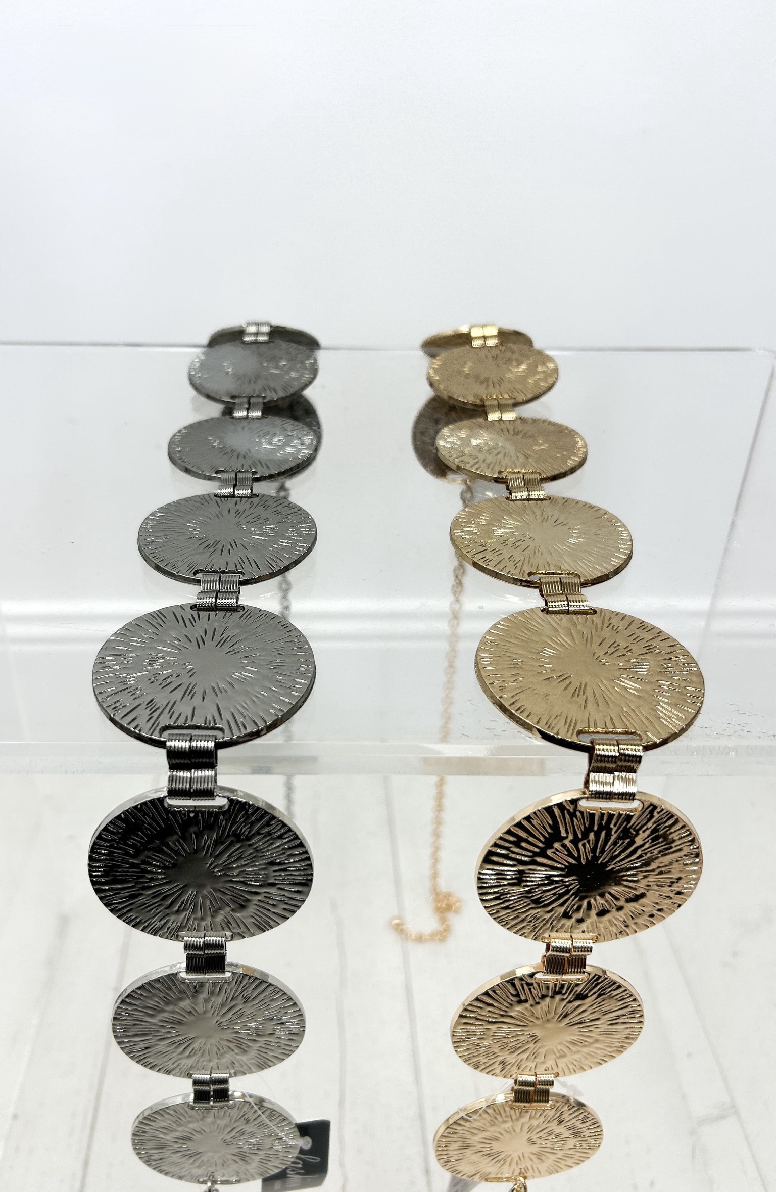 Chaque médaillon présente un effet texturé travaillé, créant un jeu de reliefs subtil qui capte la lumière avec élégance. L’assemblage articulé assure une belle fluidité une fois portée, épousant naturellement la taille sans rigidité. Son rendu bijou en fait un accessoire à part entière, idéal pour structurer une tenue tout en ajoutant du caractère.