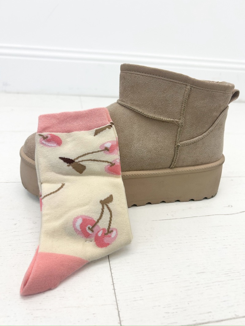Associer ces chaussettes à des boots beige ou écru, comme sur la photo, crée un look cosy, chic et chaleureux. Le motif cerises apporte une touche de fantaisie qui ressort délicatement sans être trop marquée.