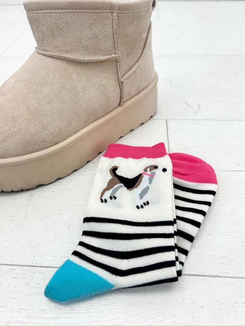 Leur design combine un motif chien stylisé sur le dessus du pied avec un jeu de rayures noir et blanc très moderne. Les finitions colorées — pointe turquoise et bord côte rose fuchsia — ajoutent une note pop et dynamique qui fait toute la différence.