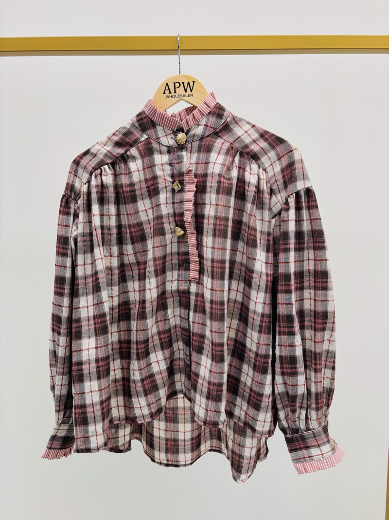 Sa coupe ample apporte du volume et une belle fluidité, tandis que ses détails soignés — col montant froncé, boutons dorés sculptés, plastron à volants et poignets contrastés rayés — lui donnent une allure travaillée et élégante.