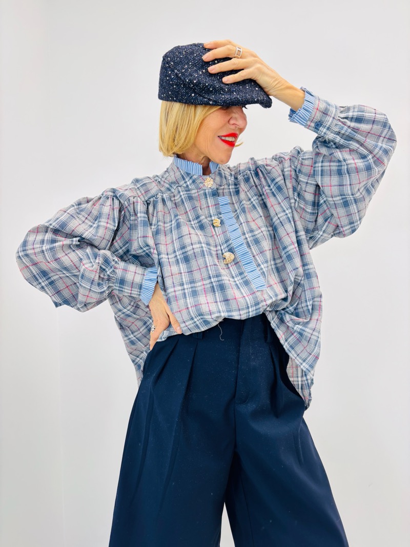 Portée en version bleu comme sur la photo, cette chemise révèle toute sa personnalité. Sa coupe ample permet un porté décontracté chic, parfait pour rentrer légèrement dans un pantalon taille haute comme un palazzo ou un pantalon droit.