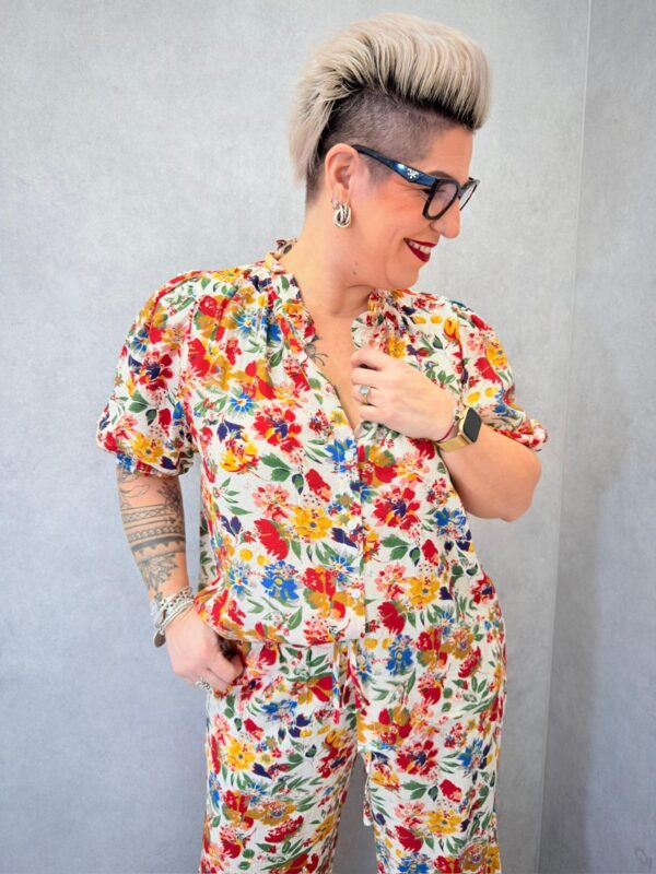 La patte de boutonnage centrale, ornée de boutons discrets, est également rehaussée d’un galon contrasté, créant un joli rappel graphique et renforçant la finition soignée du modèle. Les manches longues légèrement froncées, terminées par des poignets boutonnés, apportent du volume et de la douceur à la silhouette.