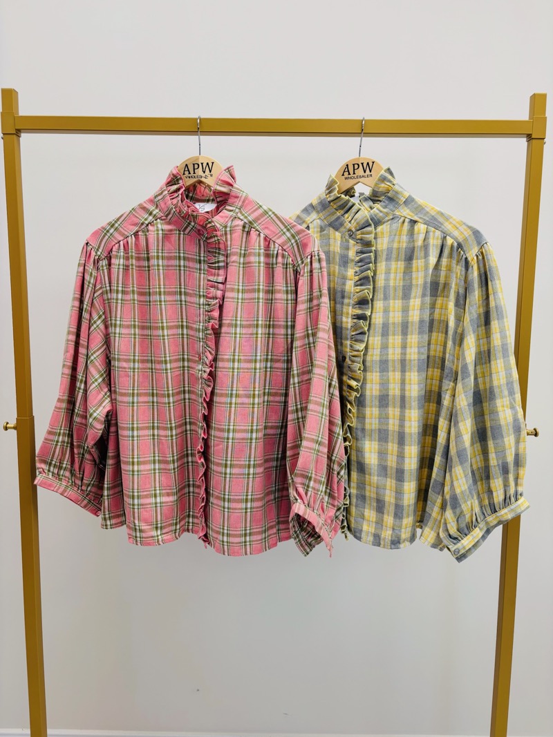 Ce modèle se distingue par son joli détail de volants le long de la patte de boutonnage, qui structure le devant et apporte une note romantique très tendance. Le col légèrement montant avec finition volantée renforce cet esprit féminin, tout en restant élégant et moderne. La coupe est fluide, avec un volume légèrement ample qui convient parfaitement à une silhouette décontractée mais soignée.