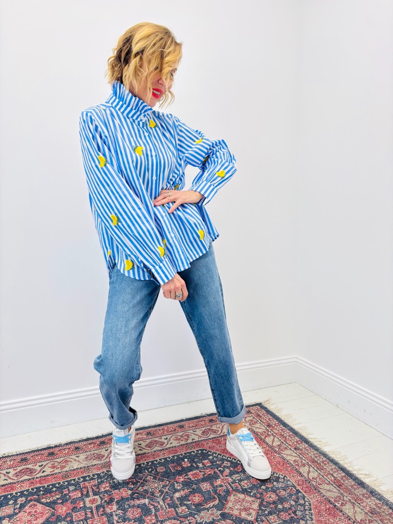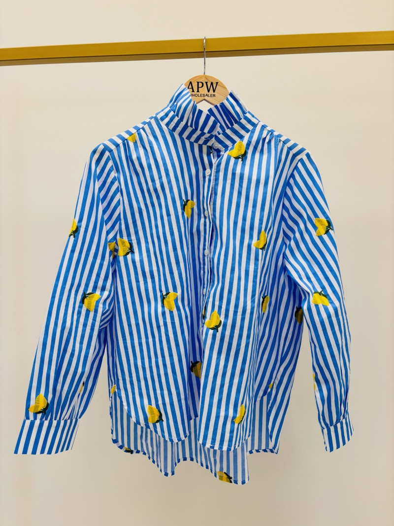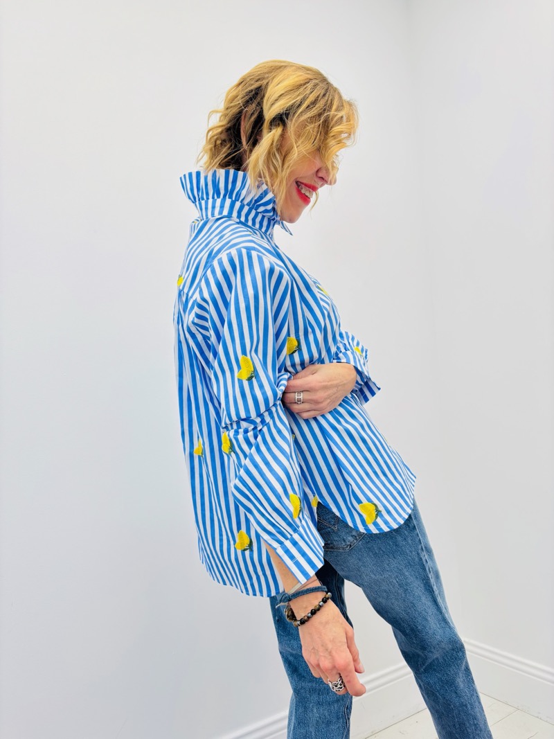 Son design associe des rayures verticales bleu et blanc à un motif citron brodé, créant un contraste lumineux et plein de caractère. Le col victorien structuré, subtilement montant, apporte une note élégante et raffinée, tandis que la patte de boutonnage discrète conserve une allure épurée et féminine.