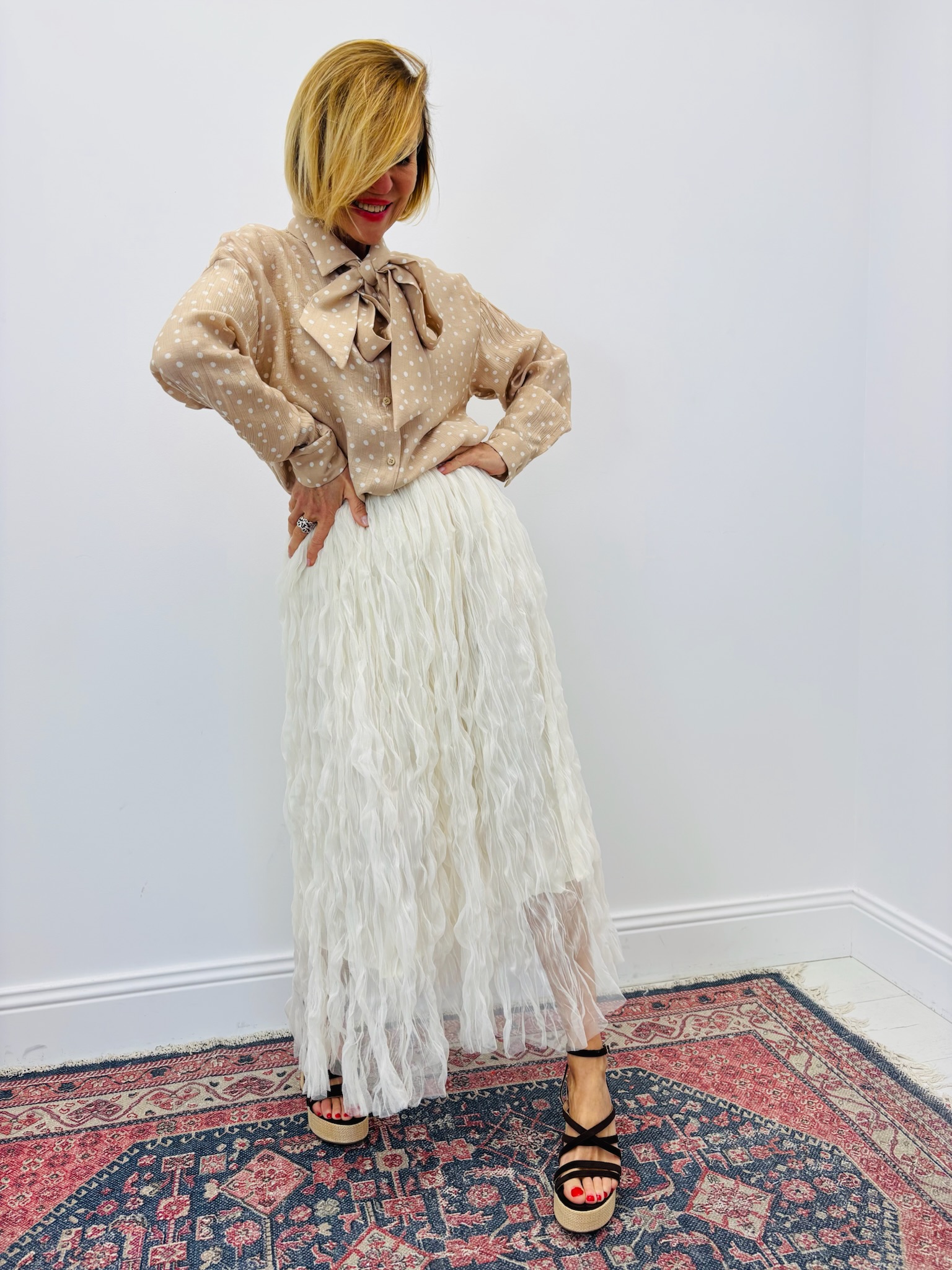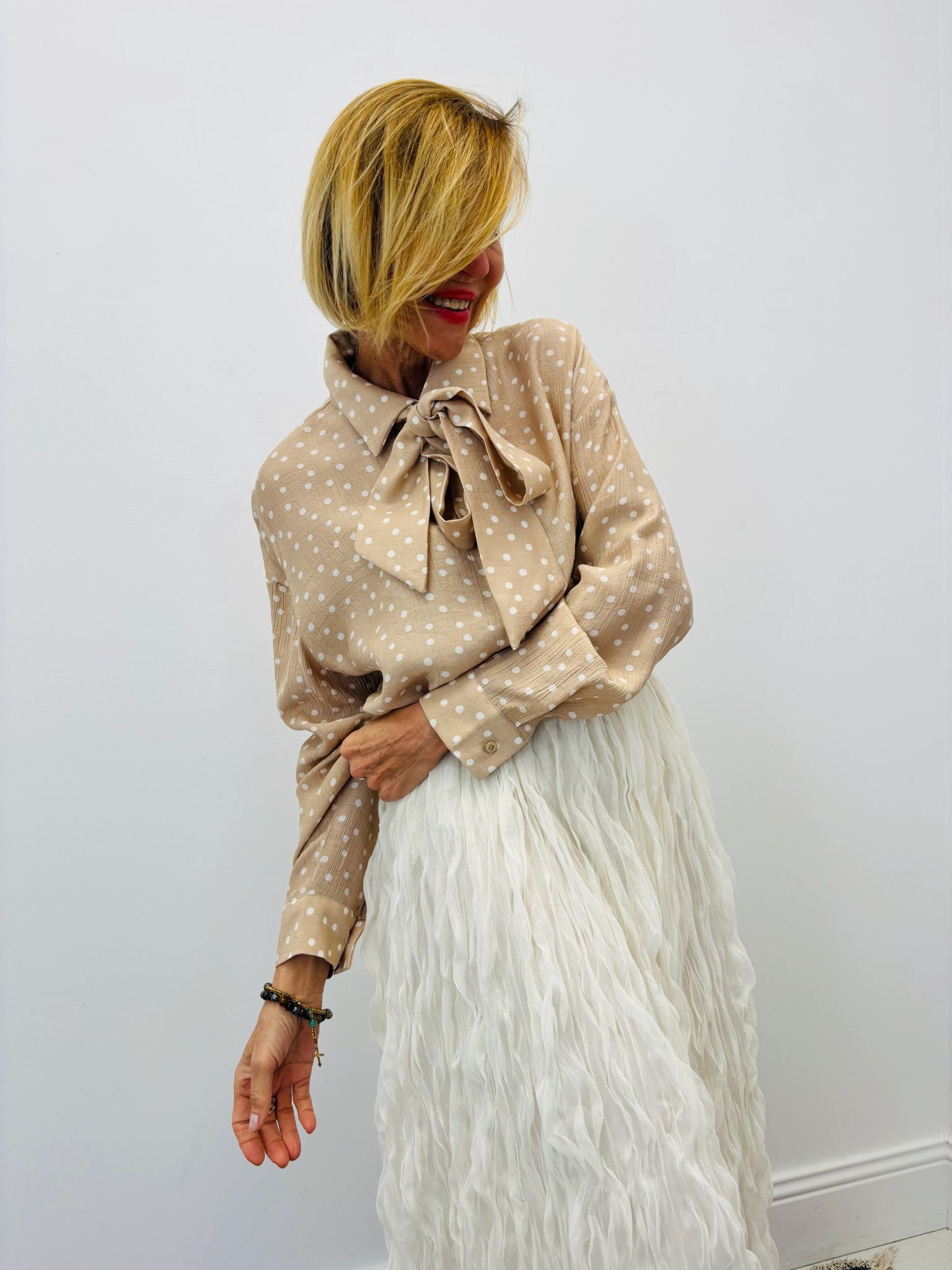 Déclinée en coloris doux et naturels, cette chemise à pois est une valeur sûre en boutique, très appréciée pour sa polyvalence et son style intemporel.
