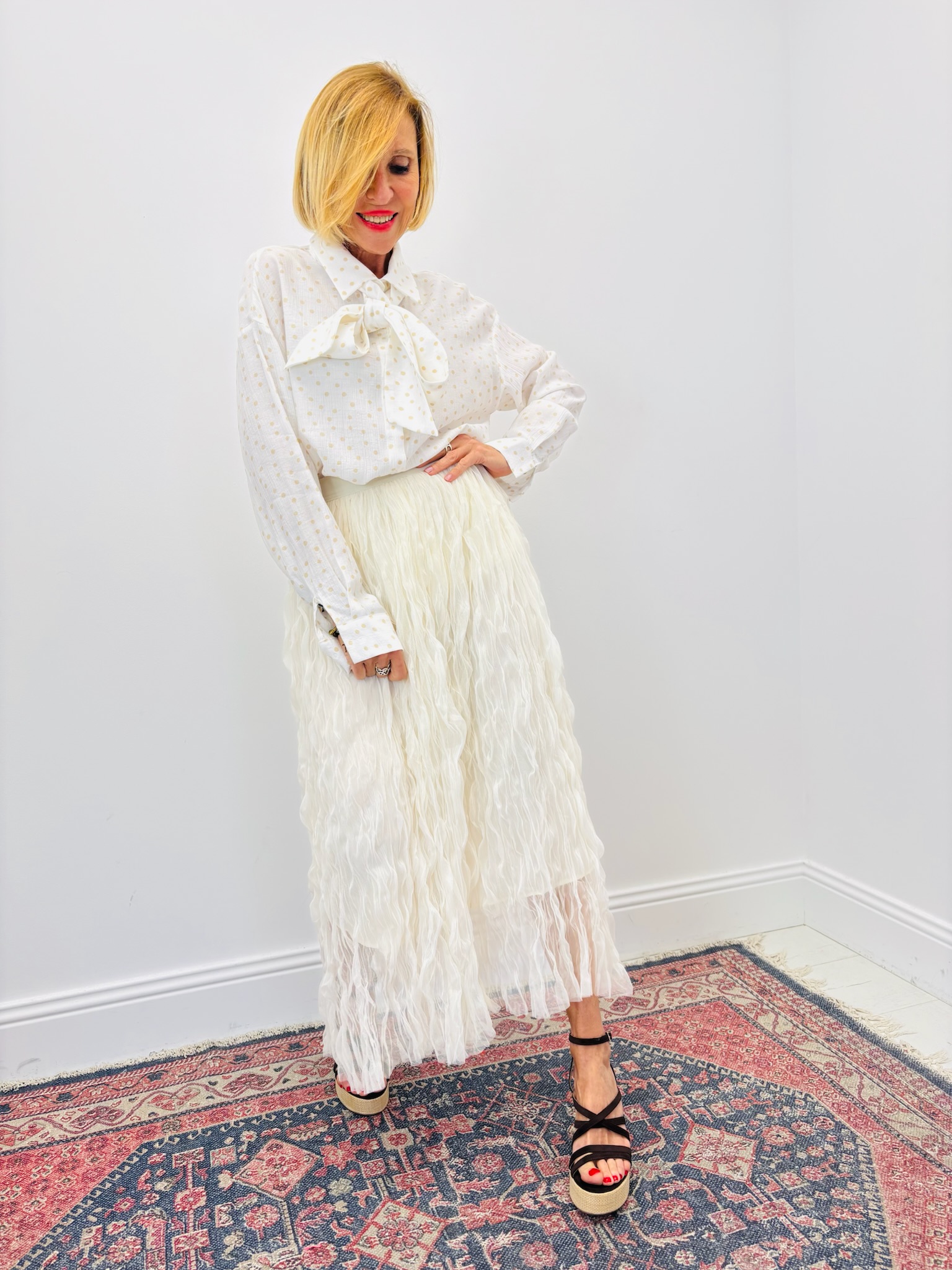 Féminine et élégante, cette chemise à motif pois revisite un grand classique du vestiaire avec une touche raffinée et intemporelle. Son imprimé à pois délicats apporte du charme et de la douceur, tandis que la lavallière intégrée sublime l’ensemble avec une note chic et sophistiquée.