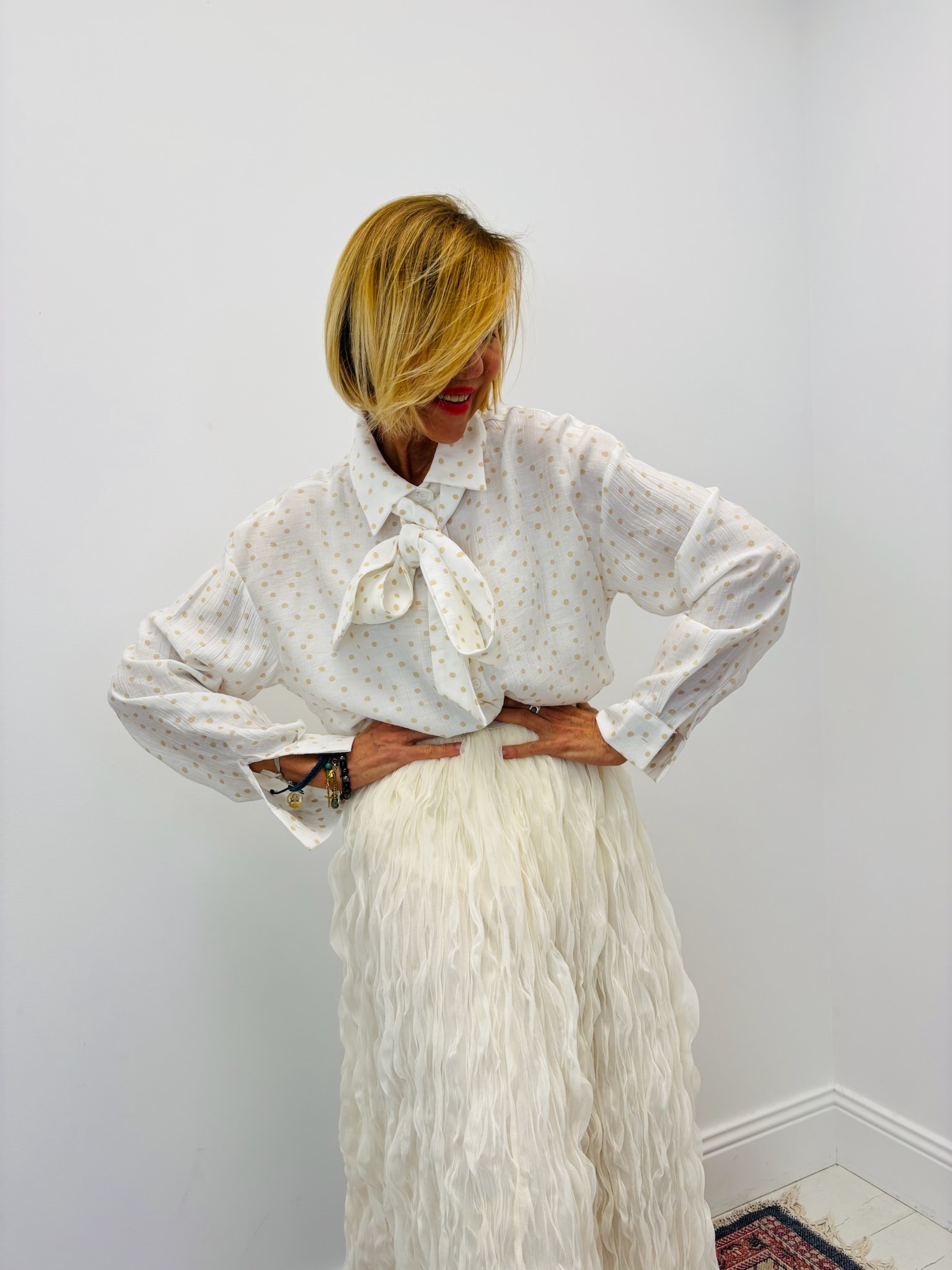 Nouée avec la lavallière pour un look chic et féminin ou portée plus simplement pour une allure décontractée élégante, cette chemise à pois s’adapte à toutes les envies. Une pièce facile à vendre, idéale pour enrichir une sélection de chemises raffinées et intemporelles en boutique.