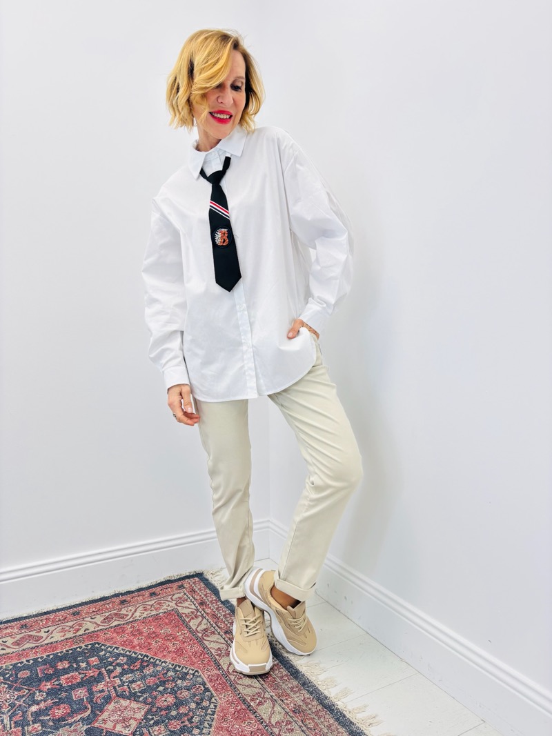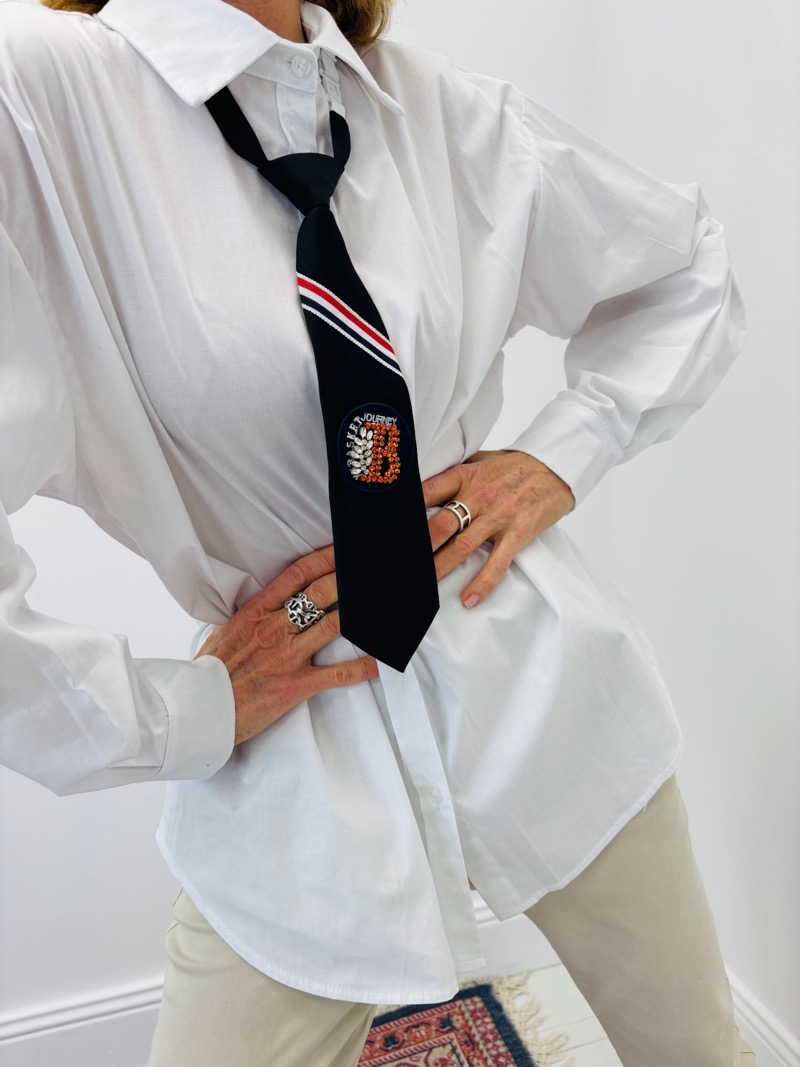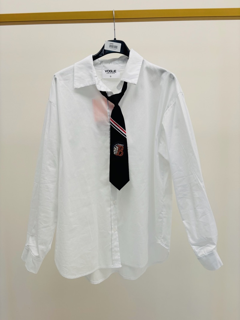 Cette chemise avec cravate intégrée revisite le grand classique de la chemise blanche avec une touche preppy chic et contemporaine. Pensée comme une pièce forte, elle associe élégance intemporelle et détail mode affirmé, idéale pour structurer une silhouette sans effort.