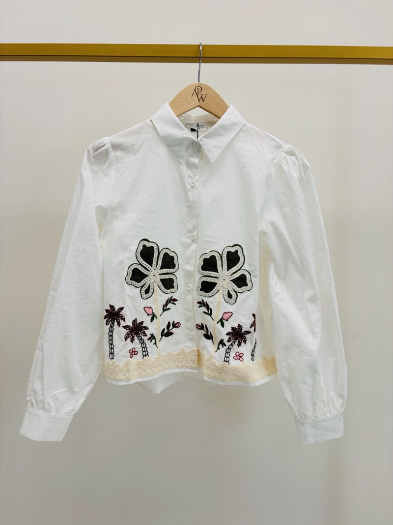Cette chemise blanche en 100% coton séduit par son esprit romantique et artisanal. Sa base lumineuse est sublimée par de délicates broderies florales placées sur le bas du modèle, mêlant nuances de vert et touches de rouge pour un rendu raffiné et original.