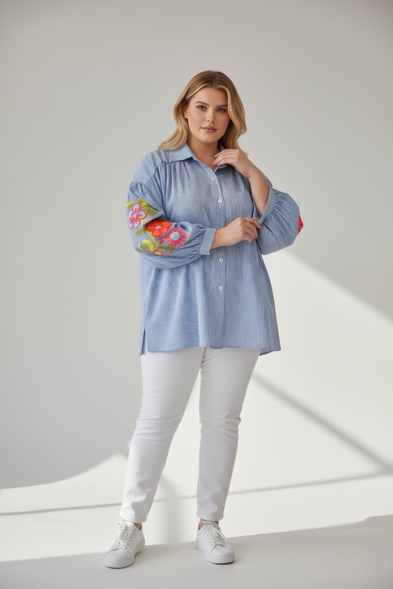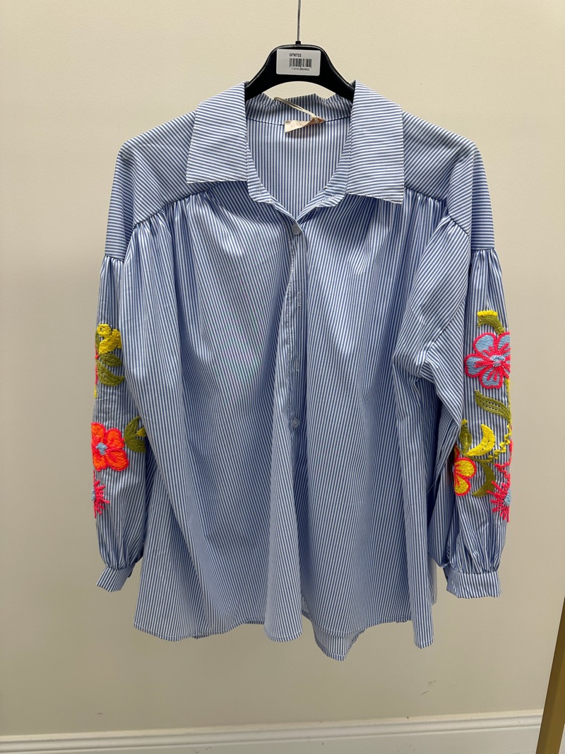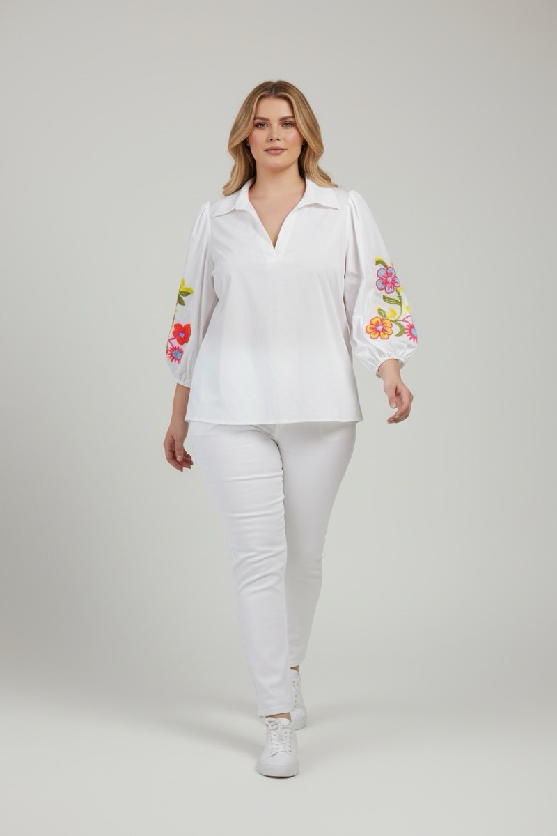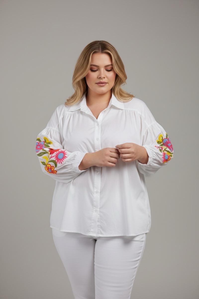 Apportez une touche de fraîcheur et de féminité à votre sélection avec cette chemise blanche sublimée par des broderies florales colorées sur les manches. Une pièce intemporelle revisitée, parfaite pour une collection printemps-été élégante et facile à porter.