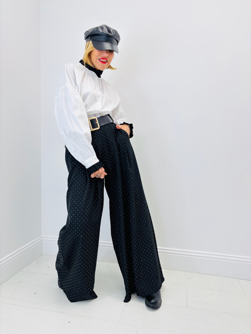 un pantalon palazzo noir à micro-pois,