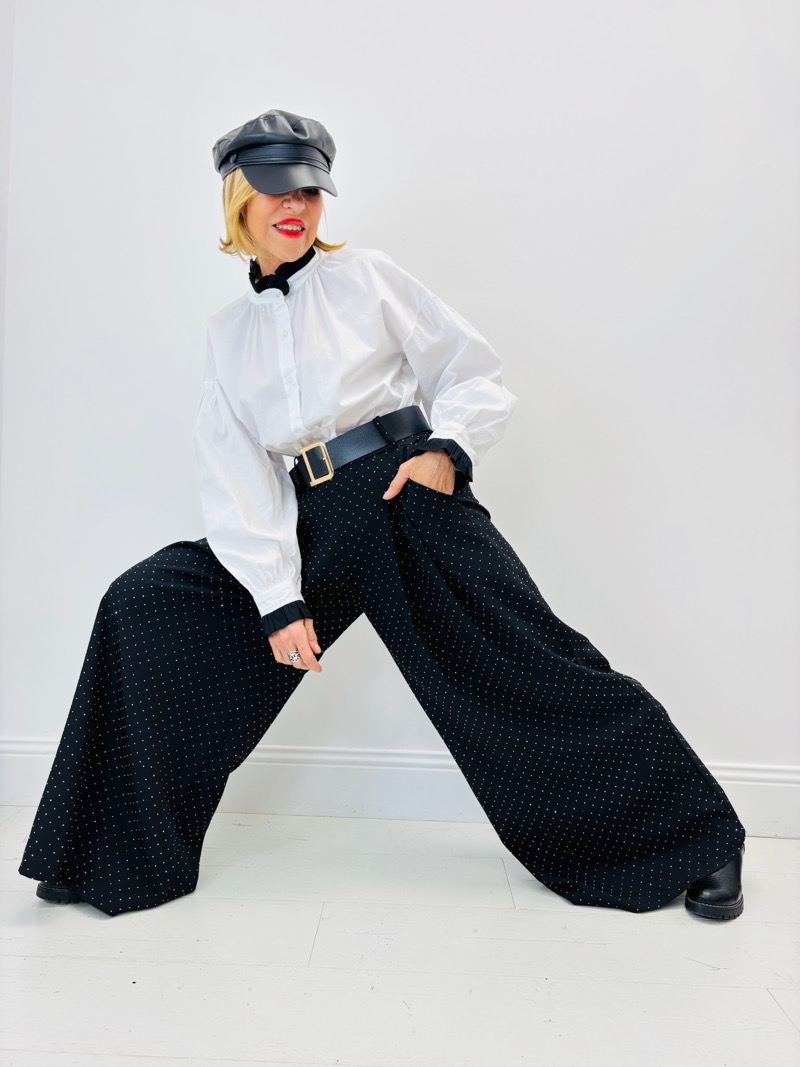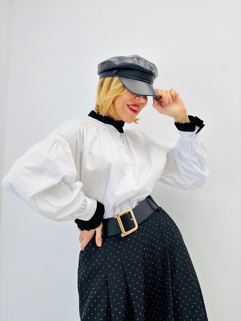 Le contraste entre la pureté de la chemise blanche et la profondeur du pantalon noir crée une silhouette élégante et graphique. Le col victorien ajoute un effet “couture”, tandis que les manches bouffantes donnent du volume et du caractère à l’ensemble.