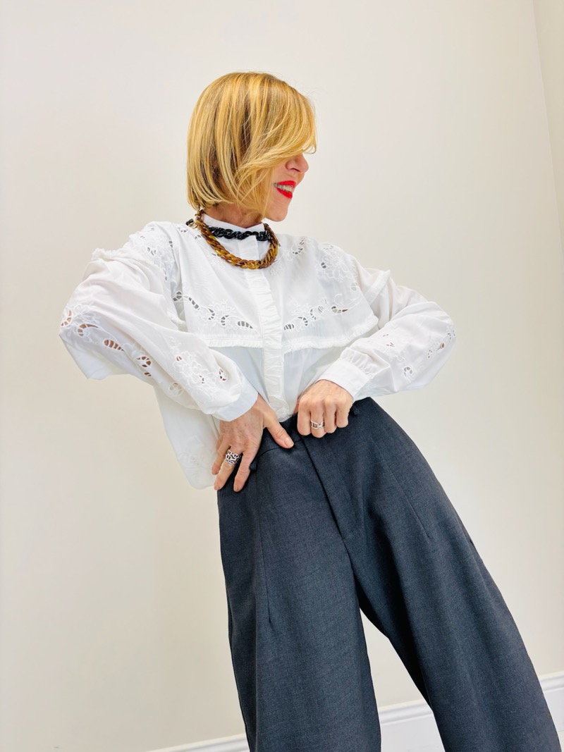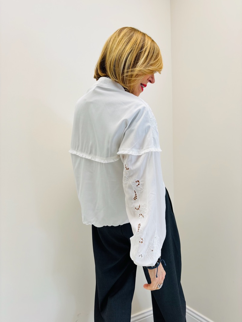 La patte de boutonnage discrète, associée à une bande brodée horizontale sur la poitrine, souligne la construction soignée de la chemise. Les manches longues légèrement bouffantes, resserrées aux poignets, apportent une touche romantique et équilibrent parfaitement la coupe.