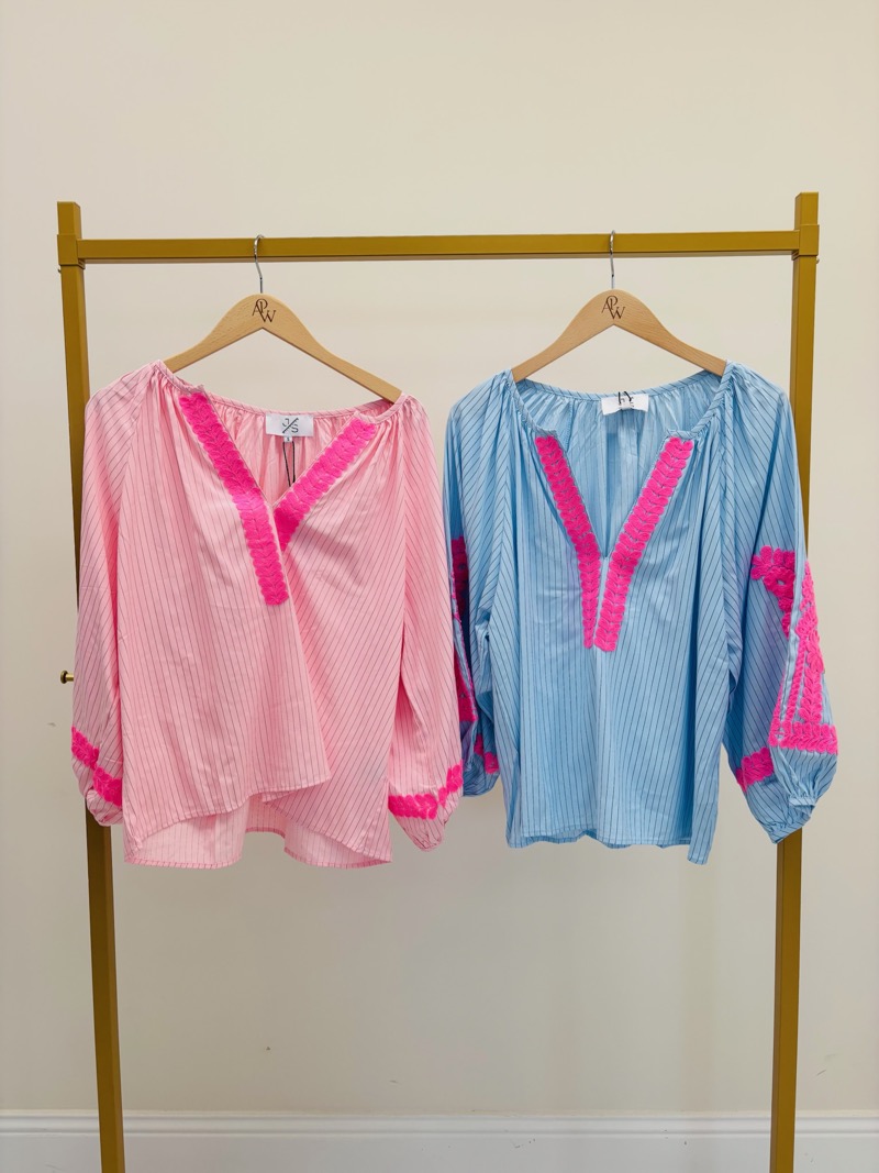 Cette chemise brodée séduit par son mélange subtil de rayures fines et de broderies contrastées, apportant une touche moderne et lumineuse. Déclinée en rose et en bleu, elle est rehaussée de broderies fluo qui dynamisent immédiatement la silhouette.