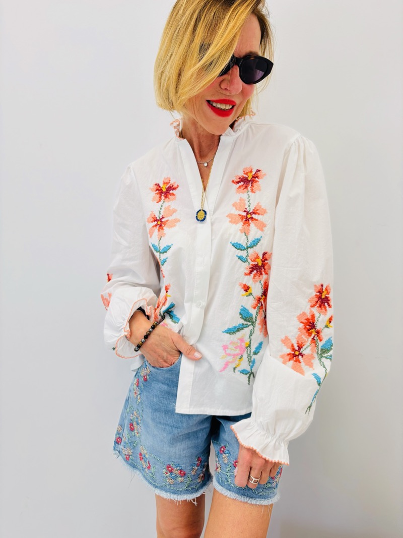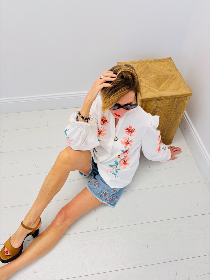 Les broderies florales colorées apportent un contraste subtil sur le fond blanc, créant un effet visuel raffiné et très attractif en boutique. Les manches légèrement bouffantes et les finitions délicates au col et aux poignets renforcent son style bohème chic.