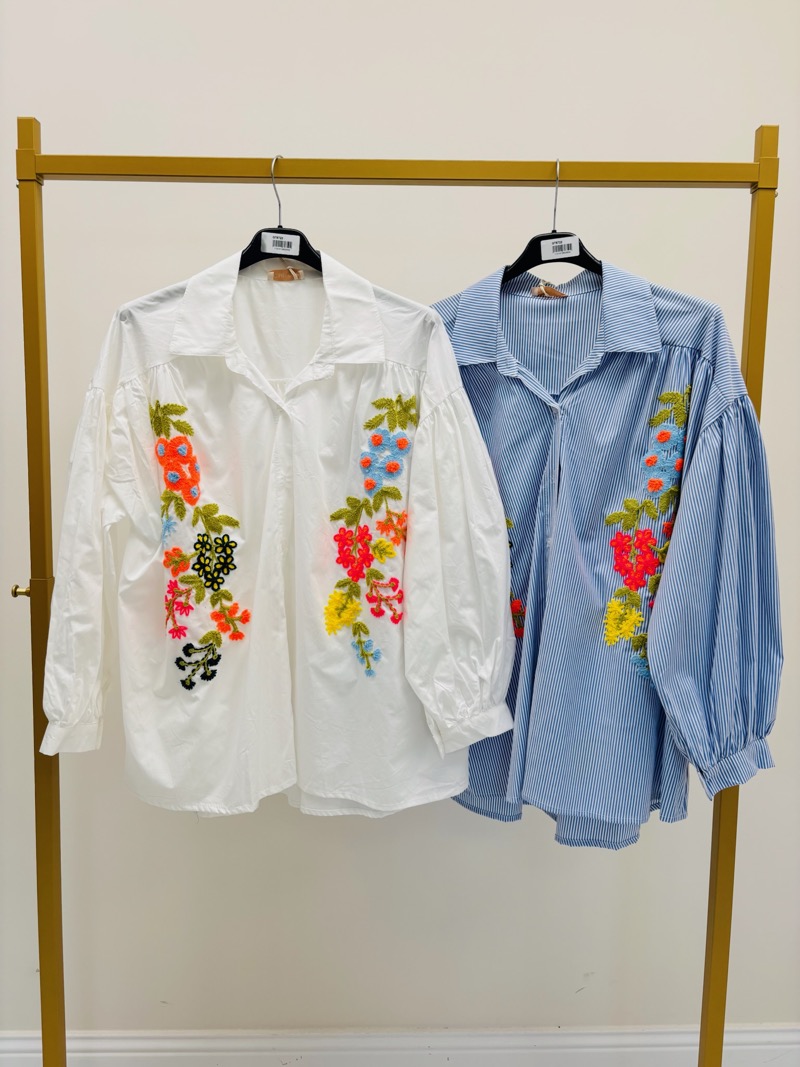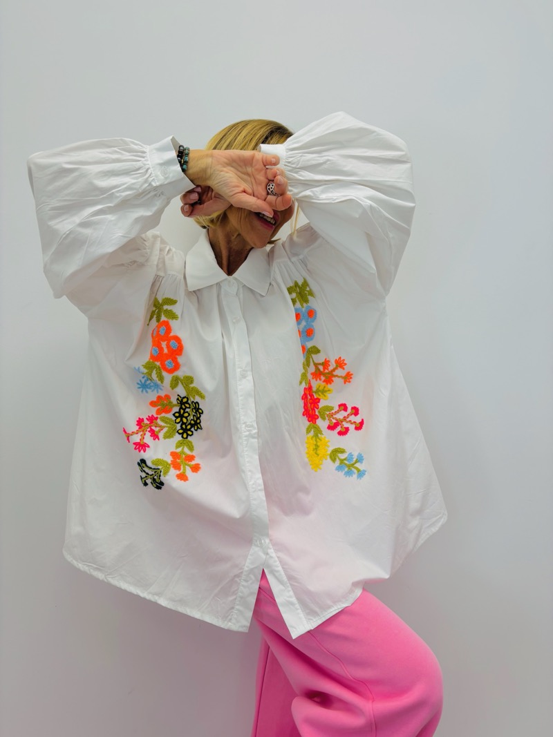 Cette chemise brodée oversize est une pièce forte qui associe confort, modernité et détail artisanal. Son volume ample et ses manches généreuses créent une silhouette actuelle, tout en conservant une allure féminine et élégante.